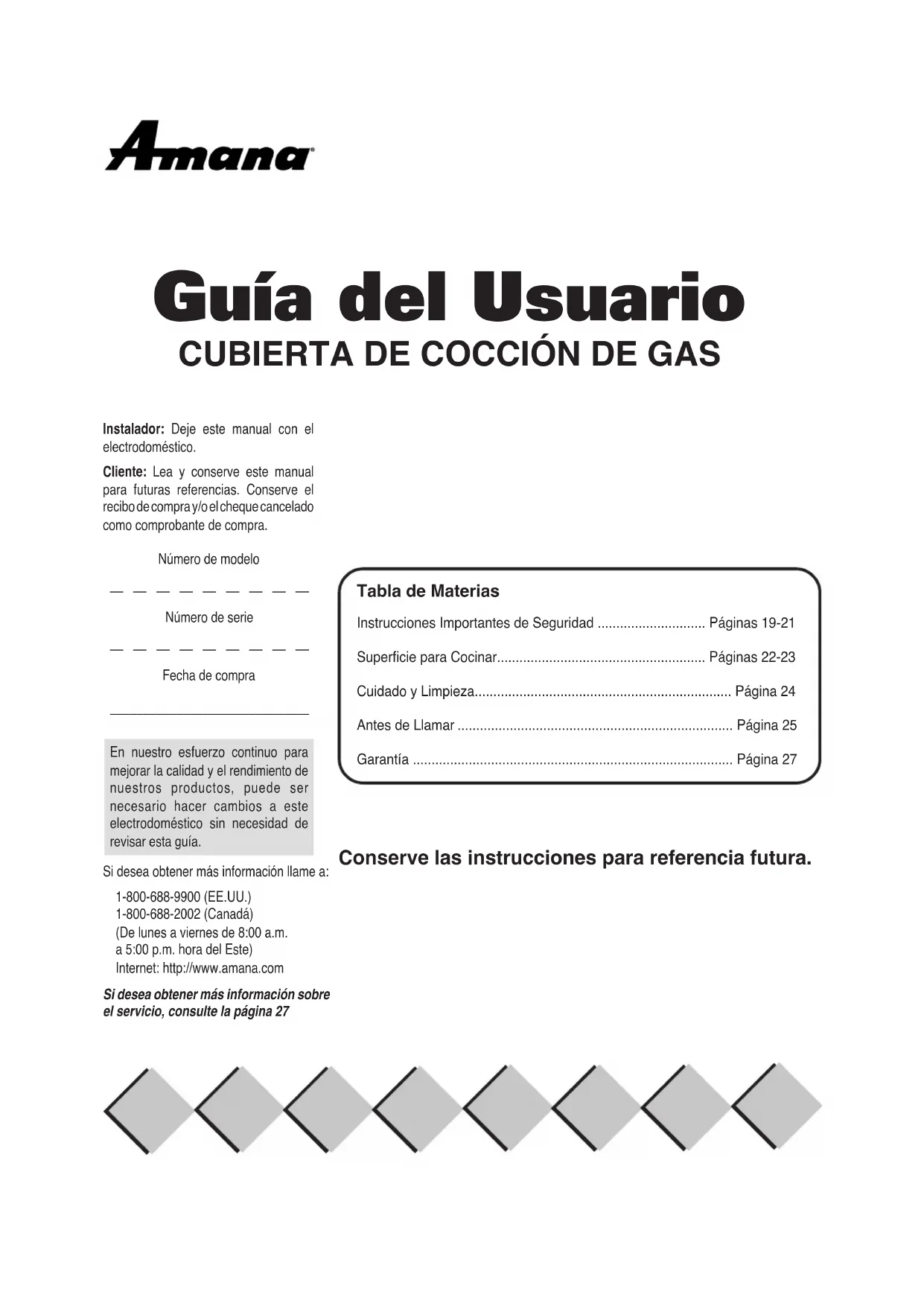 JURIDIQUES SPÉCIFIQUES ET IL SE PEUT QUE VOUS AYIEZ D’AUTRES DROITS, QUI VARIENT D’UN ÉTAT À L’AUTRE OU D’UNE PROVINCE À L’AUTRE. Remarques : Veillez à fournir l’information suivante lorsque vous communiquez avec nous au sujet d’un problème : a. Vos nom, adresse et numéro de téléphone; b. Numéro de modèle et numéro de série de l’appareil; c. Nom et adresse de votre détaillant ou de votre agence de service; d. Description détaillée du problème observé; e. Preuve d’achat (facture de vente).Instalador: Deje este manual con elelectrodoméstico.Cliente: Lea y conserve este manualpara futuras referencias. Conserve elrecibo de compra y/o el cheque canceladocomo comprobante de compra.Número de modelo–– –– –– –– –– –– –– –– ––Número de serie–– –– –– –– –– –– –– –– ––Fecha de compra______________________________Si desea obtener más información llame a:1-800-688-9900 (EE.UU.)1-800-688-2002 (Canadá)(De lunes a viernes de 8:00 a.m.a 5:00 p.m. hora del Este)Internet: http://www.amana.com Si desea obtener más información sobre el servicio, consulte la página 27 En nuestro esfuerzo continuo paramejorar la calidad y el rendimiento denuestros productos, puede sernecesario hacer cambios a esteelectrodoméstico sin necesidad derevisar esta guía. Tabla de Materias Instrucciones Importantes de Seguridad ............................. Páginas 19-21Superficie para Cocinar........................................................ Páginas 22-23Cuidado y Limpieza..................................................................... Página 24 Antes de Llamar .......................................................................... Página 25 Garantía ...................................................................................... Página 27 Conserve las instrucciones para referencia futura. Guía del Usuario CUBIERTA DE COCCIÓN DE GASINSTRUCCIONES IMPORTANTES DE SEGURIDAD INSTRUCCIONES DE SEGURIDAD Las advertencias y las instruccionesimportantes de seguridad que aparecen eneste manual no tienen el propósito de cubrirtodas las condiciones posibles que podríanocurrir. Debe usarse sentido común,precaución y cuidado cuando se instale, sepresente mantenimiento o se oprere elcongelador.Siempre comuníquese con el distribuidor,concesionario, agente de servicio ofabricante para los asuntos relacionadoscon problemas o condiciones que noentienda.RECONOZCA LOS SÍMBOLOS, PALA-BRAS Y ETIQUETAS DE SEGURIDADADVERTENCIA – Riesgos o prácticasinseguras que PODRÍAN causar lesionespersonales graves o la muerte.PRECAUCIÓN – Riesgos o prácticasinseguras que PODRÍAN causar lesionespersonales menores. ADVERTENCIA PRECAUCIÓN Lea y siga todas las instrucciones antesde usar este eléctrodoméstico para evitarel riesgo potencial de incendio, choqueeléctrico, lesión personal o daño aleléctrodoméstico como resultado de su usoinapropiado. Utilice este eléctrodomésticosolamente para el propósito que ha sidodestinado según se describe en esta guía.Para asegurar funcionamiento correctoy seguro: El eléctrodoméstico debe serinstalado debidamente y puesto a tierra porun técnico calificado. No intente ajustar,reparar, prestar servicio o reparar ningunapieza de su cubierta, a menos que seaespecíficamente recomendado en esta guía.Todas las reparaciones deben serefectuadas por un técnico calificado. Pida al ADVERTENCIA: Si no se sigue estrictamente la información proporcionada en esta guía, se puede producir un incendio o una explosión, causando daños materiales, lesiones personales o mortales. – No almacene ni use gasolina ni otros vapores y líquidos inflamables en la vecindad de este eléctrodoméstico o de cualquier otro. – QUE HACER SI PERCIBE OLOR A GAS: