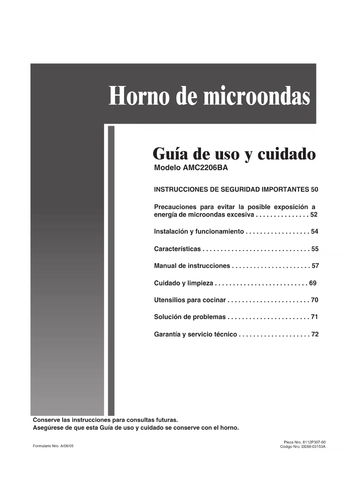 - Les guides d’utilisation, les manuels de service et les renseignements sur les pièces sont disponibles auprès du service à la clientèle de Maytag Services LLC. Remarques : Veillez à fournir l’information suivante lorsque vous communiquez avec nous au sujet d’un problème : a. Vos nom, adresse et numéro de téléphone; b. Numéro de modèle et numéro de série de l’appareil; c. Nom et adresse du détaillant avec la date l’appareil acheté ; d. Description détaillée du problème observé; e. Preuve d’achat (facture de vente).Conserve las instrucciones para consultas futuras. Asegúrese de que esta Guía de uso y cuidado se conserve con el horno. Guía de uso y cuidado Modelo AMC2206BA Horno de microondas Pieza Nro. 8112P307-60Código Nro. DE68-03153AFormulario Nro. A/08/05