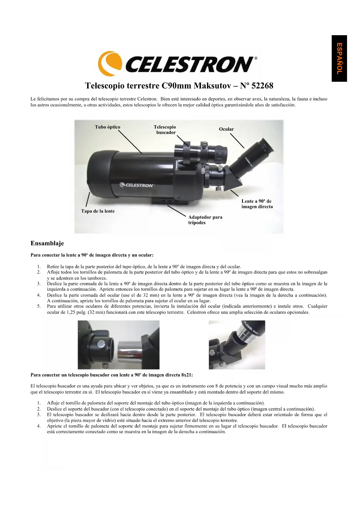2. Deslice el soporte del buscador (con el telescopio conectado) en el soporte del montaje del tubo óptico (imagen central a continuación). 3. El telescopio buscador se deslizará hacia dentro desde la parte posterior. El telescopio buscador deberá estar orientado de forma que el objetivo (la pieza mayor de vidrio) esté situado hacia el extremo anterior del telescopio terrestre. 4. Apriete el tornillo de palometa del soporte del montaje para sujetar firmemente en su lugar el telescopio buscador. El telescopio buscador está correctamente conectado como se muestra en la imagen de la derecha a continuación. Tubo óptico Telescopio buscador Ocular Tapa de la lente Adaptador para trípodes Lente a 90º de imagen directa ESPAÑOLPara conectar su telescopio terrestre a un trípode para cámaras de fotos o vídeo Coloque su telescopio terrestre en el trípode estable para cámaras de fotos o vídeo antes de observar, ya que el tamaño y la potencia del mismo requieren un trípode estable para poder disfrutar de una visualización clara y fija. En la parte inferior del telescopio se encuentra un adaptador para trípodes (vea la imagen de la página 1) que tiene un orificio roscado de 1/4x20 para permitir conectar el trípode al telescopio. Celestron ofrece trípodes opcionales de fotos y vídeo.