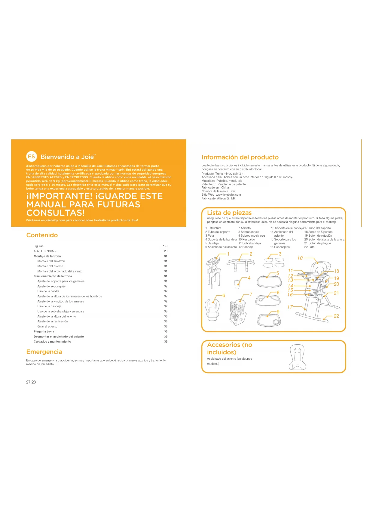1 Estructura2 Tubo del soporte3 Pata4 Soporte de la bandeja5 Bandeja6 Acolchado del asiento7 Asiento8 Sobrebandeja9 Sobrebandeja peq10 Respaldo11 Sobrebandeja12 Bandeja 13 Soporte de la bandeja14 Acolchado del asiento15 Soporte para los gemelos16 Reposapiés17 Tubo del soporte18 Arnés de 5 puntos19 Botón de rotación20 Botón de ajuste de la altura21 Botón de pliegue22 Pata Información del producto Lea todas las instrucciones incluidas en este manual antes de utilizar este producto. Si tiene alguna duda, póngase en contacto con su distribuidor local.Producto Trona mimzy spin 3in1Adecuada para bebés con un peso inferior a 15kg (de 0 a 36 meses)Materiales Plástico, metal, telaPatente n.º Pendiente de patenteFabricado en ChinaNombre de la marca JoieSitio Web www.joiebaby.comFabricante Allison GmbH