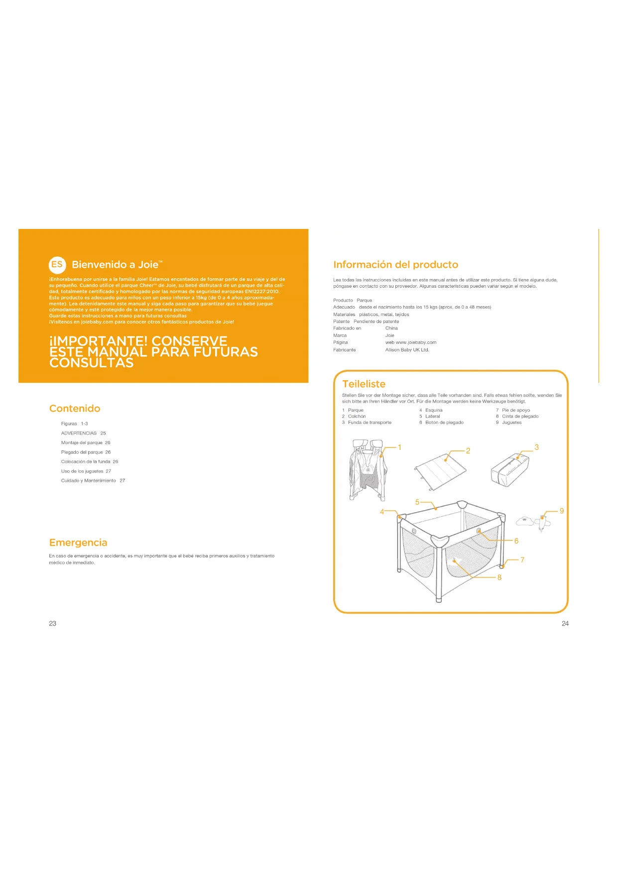 CONSULTAS Contenido Figuras 1-3ADVERTENCIAS 25Montaje del parque 26Plegado del parque 26Colocación de la funda 26Uso de los juguetes 27Cuidado y Mantenimiento 27 Emergencia En caso de emergencia o accidente, es muy importante que el bebé reciba primeros auxilios y tratamiento médico de inmediato. Información del producto Lea todas las instrucciones incluidas en este manual antes de utilizar este producto. Si tiene alguna duda, póngase en contacto con su proveedor. Algunas características pueden variar según el modelo.Producto ParqueAdecuado desde el nacimiento hasta los 15 kgs (aprox. de 0 a 48 meses)Materiales plásticos, metal, tejidosPatente Pendiente de patenteFabricado en ChinaMarca JoiePágina web www.joiebaby.comFabricante Allison Baby UK Ltd.1 Parque2 Colchón3 Funda de transporte4 Esquina5 Lateral6 Botón de plegado7 Pie de apoyo8 Cinta de plegado9 Juguetes Teileliste Stellen Sie vor der Montage sicher, dass alle Teile vorhanden sind. Falls etwas fehlen sollte, wenden Siesich bitte an Ihren Händler vor Ort. Für die Montage werden keine Werkzeuge benötigt.