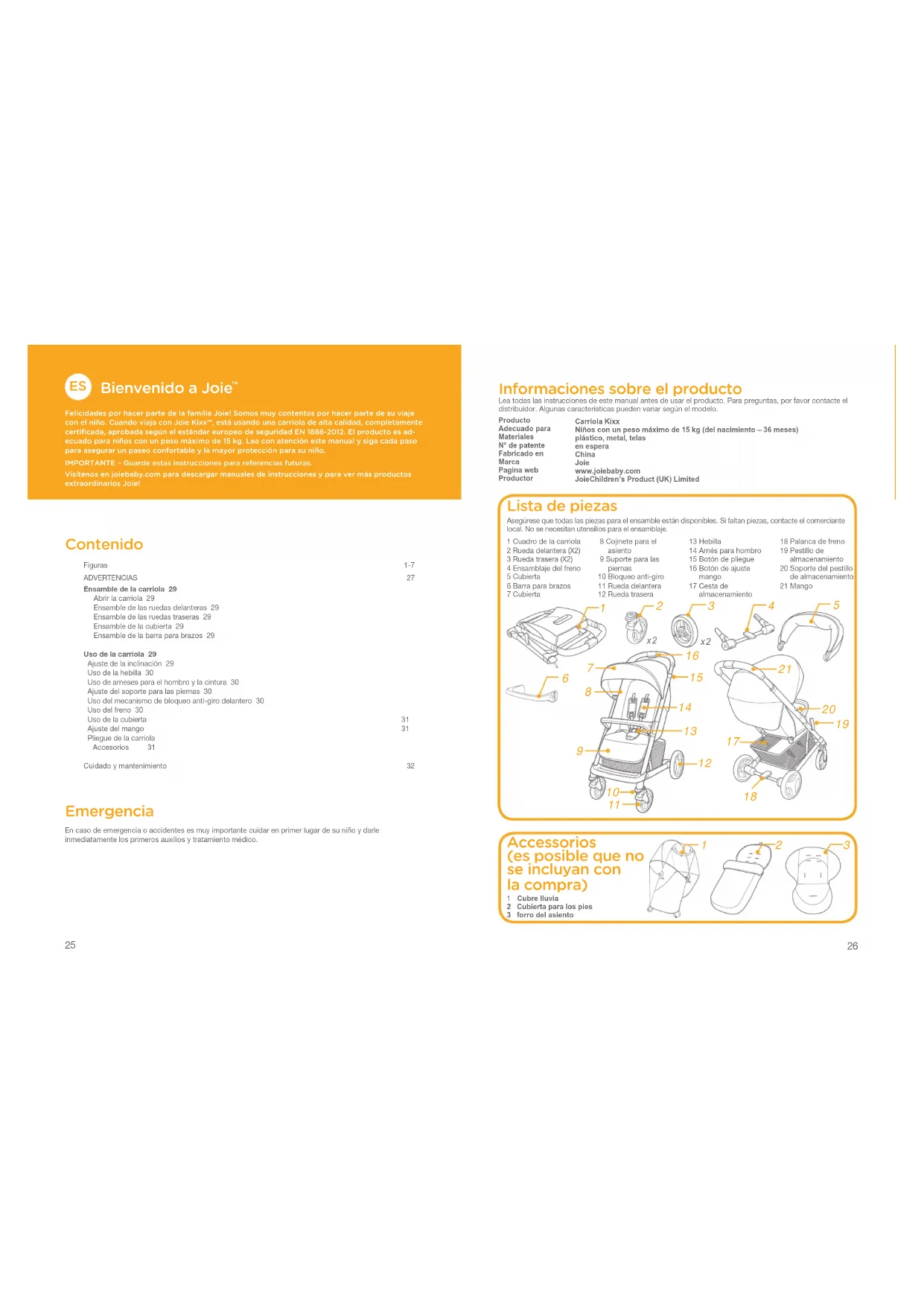 Felicidades por hacer parte de la familia Joie! Somos muy contentos por hacer parte de su viaje con el niño. Cuando viaja con Joie Kixx™, está usando una carriola de alta calidad, completamente certificada, aprobada según el estándar europeo de seguridad EN 1888-2012. El producto es ad-ecuado para niños con un peso máximo de 15 kg. Lea con atención este manual y siga cada paso para asegurar un paseo confortable y la mayor protección para su niño. IMPORTANTE – Guarde estas instrucciones para referencias futuras.Visítenos en joiebaby.com para descargar manuales de instrucciones y para ver más productos extraordinarios Joie! Contenido Figuras 1-7ADVERTENCIAS 27Ensamble de la carriola 29 Abrir la carriola 29 Ensamble de las ruedas delanteras 29 Ensamble de las ruedas traseras 29 Ensamble de la cubierta 29 Ensamble de la barra para brazos 29Uso de la carriola 29 Ajuste de la inclinación 29 Uso de la hebilla 30 Uso de arneses para el hombro y la cintura 30 Ajuste del soporte para las piernas 30 Uso del mecanismo de bloqueo anti-giro delantero 30 Uso del freno 30 Uso de la cubierta 31 Ajuste del mango 31 Pliegue de la carriola Accesorios 31Cuidado y mantenimiento 32 Emergencia En caso de emergencia o accidentes es muy importante cuidar en primer lugar de su niño y darle inmediatamente los primeros auxilios y tratamiento médico. Informaciones sobre el producto Lea todas las instrucciones de este manual antes de usar el producto. Para preguntas, por favor contacte el distribuidor. Algunas características pueden variar según el modelo.ProductoAdecuado paraMaterialesN° de patente Fabricado enMarcaPagina webProductorCarriola KixxNiños con un peso máximo de 15 kg (del nacimiento – 36 meses)plástico, metal, telasen esperaChina Joie www.joiebaby.comJoieChildren’s Product (UK) Limited