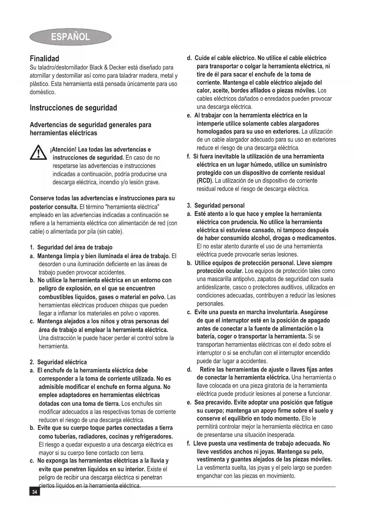 Kevin Hewitt Director de Ingeniería del Consumidor Spennymoor, County Durham DL16 6JG, Reino Unido 22-5-2009 Garantía Black & Decker confía plenamente en la calidad de sus productos y ofrece una garantía extraordinaria. Esta declaración de garantía es una añadido, y en ningún caso un perjuicio para sus derechos estatutarios. La garantía es válida dentro de los territorios de los Estados Miembros de la Unión Europea y de los de la Zona Europea de Libre Comercio. Si un producto Black & Decker resultará defectuoso debido a materiales o mano de obra defectuosos o a la falta de conformidad, Black & Decker garantiza, dentro de los 24 meses de la fecha de compra, la sustitución de las piezas defectuosas, la reparación de los productos sujetos a un desgaste y rotura razonables o la sustitución de tales productos para garantizar al cliente el mínimo de inconvenientes, a menos que: u El producto haya sido utilizado con propósitos comerciales, profesionales o de alquiler; u El producto haya sido sometido a un uso inadecuado o negligente; u El producto haya sufrido daños causados por objetos o sustancias extrañas o accidentes; u Se hayan realizado reparaciones por parte de personas que no sean los servicios de reparación autorizados o personal de servicios de Black & Decker. Para reclamar en garantía, será necesario que presente la prueba de compra al vendedor o al servicio técnico de reparaciones autorizado. Pueden consultar la dirección de su servicio técnico más cercano poniéndose en contacto con la ocina local de Black & Decker en la dirección que se indica en este manual. Como alternativa, se puede consultar en Internet, en la dirección siguiente, la lista de servicios técnicos autorizados e información completa de nuestros servicios de postventa y contactos: www.2helpU.com Visite nuestro sitio web www.blackanddecker.eu para registrar su nuevo producto Black & Decker y mantenerse al día sobre nuestros productos y ofertas especiales. Encontrará información adicional sobre la marca Black & Decker y nuestra gama de productos en www.blackanddecker.eu40 PORTUGUÊS Utilização O berbequim aparafusador da Black & Decker foi projectado para aparafusar e furar madeira, metal e plástico. Esta ferramenta destina-se apenas ao doméstico. Instruções de segurança Avisos de segurança gerais para ferramentas eléctricas