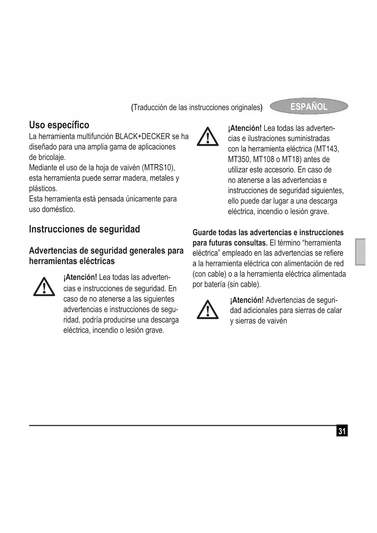 MTRS10 Black & Decker declara que los productos descri- tos en las “características técnicas” cumplen con las siguientes directivas: 2006/42/CE EN60745-1, EN60745-2-1, EN60745-2-11 Estos productos también cumplen con las Directi- vas 2014/30/UE y 2011/65/UE. Si desea obtener más información, póngase en contacto con Black & Decker a través de la siguiente dirección o consulte el dorso del manual. La persona que rma a continuación es responsa- ble de la elaboración del archivo técnico y realiza esta declaración en nombre de Black & Decker. R. Laverick Director de ingeniería Black & Decker Europe, 210 Bath Road, Slough, Berkshire, SL1 3YD Reino Unido 29/10/201437 (Tradução das instruções originais) PORTUGUÊS Utilização prevista A ferramenta multiusos BLACK+DECKER foi conce- bida para diversas aplicações de bricolage. Graças à cabeça de lâmina de movimento recí- proco (MTRS10), esta ferramenta está preparada para serrar madeira, metal e plástico. Esta ferramenta destina-se apenas a utilização doméstica. Instruções de segurança Avisos de segurança gerais para fer- ramentas eléctricas