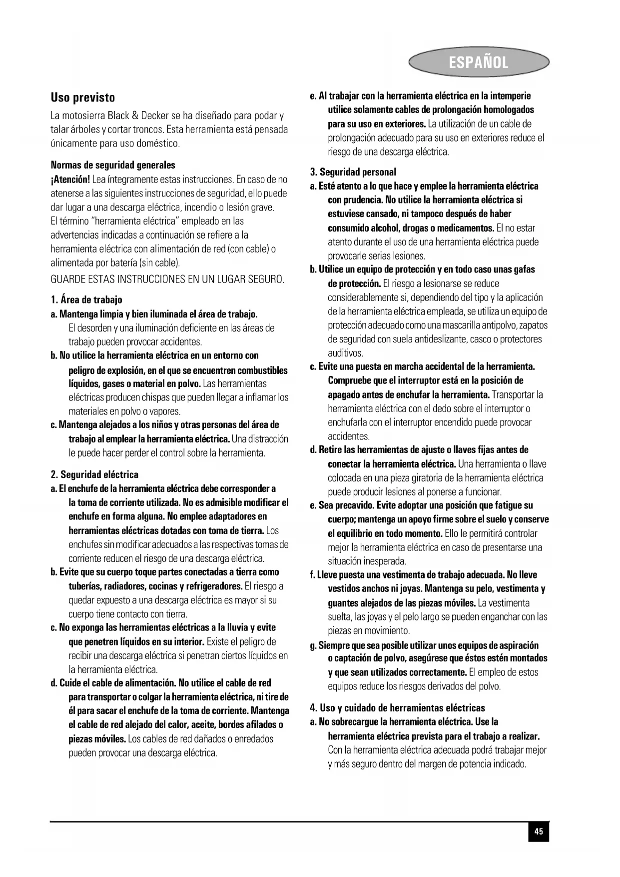 II II II II II II45 ESPAÑOL SPANISH Uso previsto La motosierra Black & Decker se ha diseñado para podar y talar árboles y cortar troncos. Esta herramienta está pensada únicamente para uso doméstico. Normas de seguridad generales ¡Atención! Lea íntegramente estas instrucciones. En caso de no atenerse a las siguientes instrucciones de seguridad, ello puede dar lugar a una descarga eléctrica, incendio o lesión grave. El término “herramienta eléctrica” empleado en las advertencias indicadas a continuación se refiere a la herramienta eléctrica con alimentación de red (con cable) o alimentada por batería (sin cable). GUARDE ESTAS INSTRUCCIONES EN UN LUGAR SEGURO.