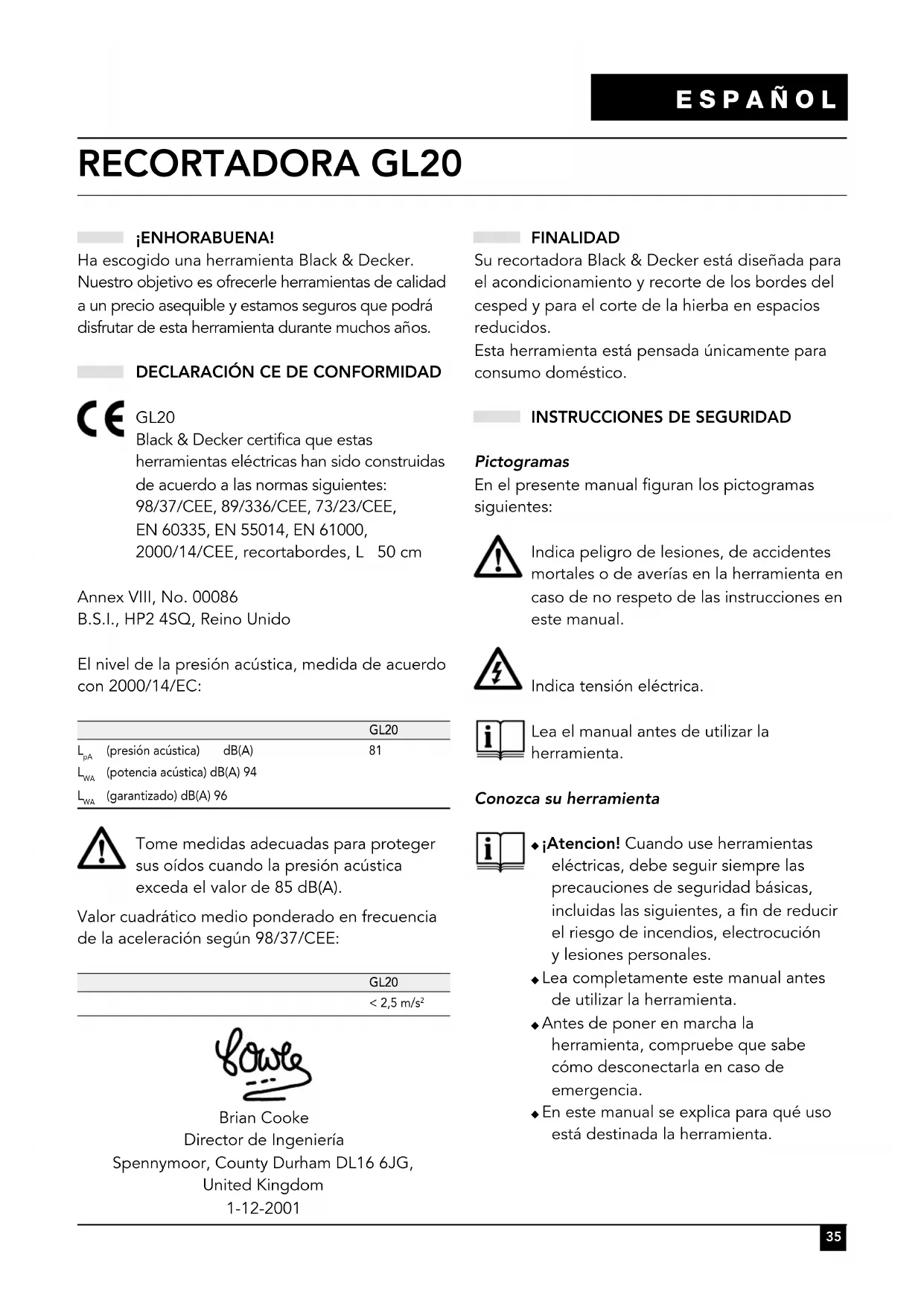 GL20 Black & Decker certifica que estas herramientas eléctricas han sido construidas de acuerdo a las normas siguientes: 98/37/CEE, 89/336/CEE, 73/23/CEE, EN 60335, EN 55014, EN 61000, 2000/14/CEE, recortabordes, L 50 cm Annex VIII, No. 00086 B.S.I., HP2 4SQ, Reino Unido El nivel de la presión acústica, medida de acuerdo con 2000/14/EC: GL20