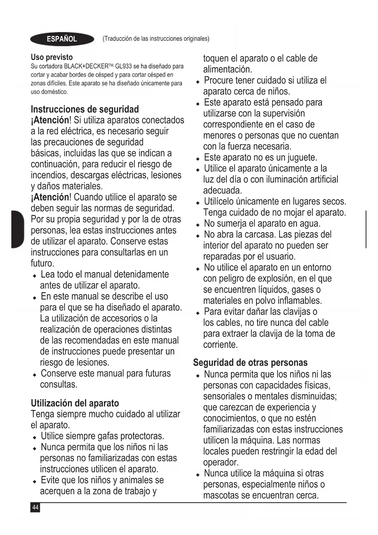 (gegarandeerd geluidsvermogen) 94 dB(A) onzekerheid (K) = 0.55 dB(A) Deze producten voldoen tevens aan richtlijn 2004/108/EG (tot 19/04/2016) 2014/30/EU (vanaf 20/04/2016) en 2011/65/EU. Neem voor meer informatie contact op met Black & Decker op het volgende adres of raadpleeg de achterzijde van de handleiding. Ondergetekende is verantwoordelijk voor de compilatie van het technische bestand en doet deze verklaring namens Black & Decker. R. Laverick Engineering Manager Black & Decker Europe, 210 Bath Road, Slough, Berkshire, SL1 3YD Verenigd Koninkrijk 08/08/2015 Garantie Black & Decker heeft vertrouwen in zijn producten en biedt consumenten een garantie van 24 maanden vanaf de aankoopdatum. Deze garantie vormt een aanvulling op uw wettelijke rechten en beperken deze niet. De garantie is geldig op het grondgebied van de Lidstaten van de Europese Unie en de Europese Vrijhandelszone. Voor een garantie-aanspraak moet uw aanspraak in overeenstemming zijn met de Voorwaarden en Condities van Black&Decker en moet u een bewijs van aankoop overleggen aan de verkoper of aan een geautoriseerde reparatiemonteur. Voorwaarden en condities van de 2-jarige garantie van Black&Decker en het adres van de vestiging van het geautoriseerde reparatiecentrum bij u in de buurt, kunt u vinden op internet op www.2helpU.com, of door contact op te nemen met het Black & Decker-kantoor ter plaatse, op het adres dat in deze handleiding wordt vermeld. Bezoek onze website www.blackanddecker.nl, waar u uw nieuwe Black & Decker-product kunt registreren en informatie kunt verkrijgen over nieuwe producten en speciale aanbiedingen.44 (Traducción de las instrucciones originales) ESPAÑOL Uso previsto Su cortadora BLACK+DECKER TM, GL933 se ha diseñado para cortar y acabar bordes de césped y para cortar césped en zonas difíciles. Este aparato se ha diseñado únicamente para uso doméstico. Instrucciones de seguridad ¡Atención! Si utiliza aparatos conectados a la red eléctrica, es necesario seguir las precauciones de seguridad básicas, incluidas las que se indican a continuación, para reducir el riesgo de incendios, descargas eléctricas, lesiones y daños materiales. ¡Atención! Cuando utilice el aparato se deben seguir las normas de seguridad. Por su propia seguridad y por la de otras personas, lea estas instrucciones antes de utilizar el aparato. Conserve estas instrucciones para consultarlas en un futuro. uLea todo el manual detenidamente antes de utilizar el aparato. uEn este manual se describe el uso para el que se ha diseñado el aparato. La utilización de accesorios o la realización de operaciones distintas de las recomendadas en este manual de instrucciones puede presentar un riesgo de lesiones. uConserve este manual para futuras consultas. Utilización del aparato Tenga siempre mucho cuidado al utilizar el aparato. uUtilice siempre gafas protectoras. uNunca permita que los niños ni las personas no familiarizadas con estas instrucciones utilicen el aparato. uEvite que los niños y animales se acerquen a la zona de trabajo y toquen el aparato o el cable de alimentación. uProcure tener cuidado si utiliza el aparato cerca de niños. uEste aparato está pensado para utilizarse con la supervisión correspondiente en el caso de menores o personas que no cuentan con la fuerza necesaria. uEste aparato no es un juguete. uUtilice el aparato únicamente a la luz del día o con iluminación articial adecuada. uUtilícelo únicamente en lugares secos. Tenga cuidado de no mojar el aparato. uNo sumerja el aparato en agua. uNo abra la carcasa. Las piezas del interior del aparato no pueden ser reparadas por el usuario. uNo utilice el aparato en un entorno con peligro de explosión, en el que se encuentren líquidos, gases o materiales en polvo inamables. uPara evitar dañar las clavijas o los cables, no tire nunca del cable para extraer la clavija de la toma de corriente. Seguridad de otras personas uNunca permita que los niños ni las personas con capacidades físicas, sensoriales o mentales disminuidas; que carezcan de experiencia y conocimientos, o que no estén familiarizadas con estas instrucciones utilicen la máquina. Las normas locales pueden restringir la edad del operador. uNunca utilice la máquina si otras personas, especialmente niños o mascotas se encuentran cerca.45 (Traducción de las instrucciones originales) ESPAÑOL Vibración El valor de emisión de vibraciones declarado en el apartado de características técnicas y en la declaración de conformidad se ha calculado según un método de prueba estándar proporcionado por la norma EN50636 y puede utilizarse para comparar una herramienta con otra. El valor de emisión de vibraciones especicado también podrá utilizarse en una evaluación preliminar de la exposición. ¡Atención! El valor de emisión de vibraciones durante el funcionamiento real de la herramienta eléctrica puede diferir del valor declarado en función de cómo se utilice dicha herramienta. El nivel de las vibraciones puede superar el indicado. Al evaluar la exposición a las vibraciones con el n de determinar las medidas de seguridad que exige la norma 2002/44/ CE para proteger a las personas que utilizan periódicamente herramientas eléctricas en el entorno laboral, deberá tenerse en cuenta una estimación de la exposición a las vibraciones, las condiciones de uso reales y el modo de empleo de la herramienta, así como los pasos del ciclo operativo como, por ejemplo, el número de veces que la herramienta se apaga, el tiempo que está parada y el tiempo de activación. Riesgos residuales El uso de esta herramienta puede producir riesgos residuales adicionales no incluidos en las advertencias de seguridad adjuntas. Estos riesgos se pueden generar por un uso incorrecto, demasiado prolongado, etc. El cumplimiento de las normas de seguridad correspondientes y el uso de dispositivos de seguridad no evitan ciertos riesgos residuales. Estos riesgos incluyen: uLesiones producidas por el co