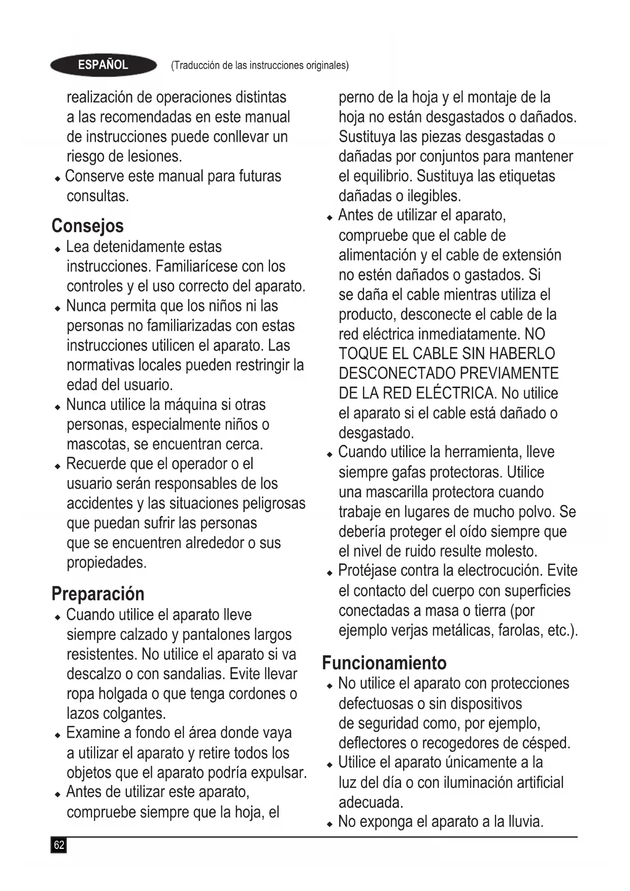 DESCONECTADO PREVIAMENTE DE LA RED ELÉCTRICA. No utilice el aparato si el cable está dañado o desgastado. u Cuando utilice la herramienta, lleve siempre gafas protectoras. Utilice una mascarilla protectora cuando trabaje en lugares de mucho polvo. Se debería proteger el oído siempre que el nivel de ruido resulte molesto. u Protéjase contra la electrocución. Evite el contacto del cuerpo con supercies conectadas a masa o tierra (por ejemplo verjas metálicas, farolas, etc.). Funcionamiento u No utilice el aparato con protecciones defectuosas o sin dispositivos de seguridad como, por ejemplo, deectores o recogedores de césped. u Utilice el aparato únicamente a la luz del día o con iluminación articial adecuada. u No exponga el aparato a la lluvia. realización de operaciones distintas a las recomendadas en este manual de instrucciones puede conllevar un riesgo de lesiones. u Conserve este manual para futuras consultas. Consejos u Lea detenidamente estas instrucciones. Familiarícese con los controles y el uso correcto del aparato. u Nunca permita que los niños ni las personas no familiarizadas con estas instrucciones utilicen el aparato. Las normativas locales pueden restringir la edad del usuario. u Nunca utilice la máquina si otras personas, especialmente niños o mascotas, se encuentran cerca. u Recuerde que el operador o el usuario serán responsables de los accidentes y las situaciones peligrosas que puedan sufrir las personas que se encuentren alrededor o sus propiedades. Preparación u Cuando utilice el aparato lleve siempre calzado y pantalones largos resistentes. No utilice el aparato si va descalzo o con sandalias. Evite llevar ropa holgada o que tenga cordones o lazos colgantes. u Examine a fondo el área donde vaya a utilizar el aparato y retire todos los objetos que el aparato podría expulsar. u Antes de utilizar este aparato, compruebe siempre que la hoja, el63 (Traducción de las instrucciones originales) ESPAÑOL No utilice el aparato en condiciones de humedad y evite que penetren líquidos en su interior. Se recomienda no utilizar el aparato sobre césped mojado. u Manténgase en todo momento rmemente apoyado al suelo, especialmente cuando esté en pendiente. Tenga en cuenta que el césped recién cortado está húmedo y resbaladizo. No trabaje en pendientes pronunciadas. u Trabaje en sentido transversal a la pendiente, nunca hacia arriba o abajo. Tenga sumo cuidado al cambiar de sentido en las pendientes. u No corte el césped en cuestas demasiado pronunciadas. u Camine, nunca corra mientras usa el aparato. No dirija el aparato hacia usted ni camine hacia atrás cuando utilice el aparato. u Siga las instrucciones para encender el aparato y mantenga los pies alejados de la hoja. u No encienda el aparato cuando se encuentra delante de la abertura de expulsión de residuos. u No levante el aparato cuando lo encienda, excepto si es necesario levantar el aparato para arrancarlo. En ese caso, no levante el aparato más de lo imprescindiblemente necesario y levante sólo la parte que esté lejos del usuario. Asegúrese de mantener ambas manos en posición de trabajo antes de volver a dejar el aparato en el suelo. u Si debe levantar el aparato y transportarlo para atravesar supercies que no sean de césped o para dirigirse al área de trabajo, apague el aparato y espere a que las cuchillas se detengan por completo. u No levante ni transporte el aparato hasta que la hoja se detenga por completo. u Mantenga las manos y los pies apartados de la hoja. u No coloque las manos ni los pies cerca o debajo de piezas giratorias. u Manténgase alejado en todo momento de las aberturas de expulsión de residuos. u Antes de dejar el aparato sin vigilancia o de eliminar una obstrucción, o cuando se disponga a cambiar, limpiar o revisar alguna de sus piezas, apáguelo, desenchufe el cable de la toma de corriente y asegúrese de que las piezas móviles se han detenido por completo. Después de golpear un objeto extraño. Compruebe que la máquina no tenga daños, si lo tiene repárelos antes de volver a ponerla en marcha y utilizarla. u Si el aparato empieza a vibrar de forma inusual o si choca con un objeto extraño, apague el aparato y desenchufe el cable de la toma de corriente. Compruebe los daños del aparado, sustituya o repare las piezas dañadas y je las piezas sueltas.64 (Traducción de las instrucciones originales) ESPAÑOL u Tenga sumo cuidado en mantener el cable de alimentación lejos de la hoja. Tenga cuidado con la posición del cable en todo momento. u Después de apagar el aparato, el motor continuará en marcha durante unos segundos. No intente forzar la hoja para que se pare. Mantenimiento y almacenamiento u Antes de utilizar el aparato, compruebe que no tenga piezas dañadas ni defectuosas. Compruebe que las piezas móviles se encuentran correctamente alineadas y en buenas condiciones, que no hay piezas rotas, y que los dispositivos de protección e interruptores están en buenas condiciones, así como cualquier otro elemento que pudiera afectar al funcionamiento de la herramienta. Asegúrese de que el aparato funciona correctamente y realiza las funciones para las que ha sido diseñado. No utilice el aparato con protecciones o cierres dañados ni mal colocados. No utilice el aparato si presenta alguna pieza dañada o defectuosa. No utilice el aparato si no es posible encenderlo y apagarlo con el interruptor. Solicite al servicio técnico autorizado la reparación o sustitución de las piezas dañadas o defectuosas. u Compruebe con regularidad que el cable no ha sufrido daños. Si se llegase a dañar el cable, deberá ser sustituido por un agente autorizado para evitar cualquier situación de riesgo. Inspeccione los cables de extensión periódicamente. Si el cable de extensión está dañado o es defectuoso, sustitúyalo inmediatamente. u Mantenga todas las tuercas, pernos y tornillos del aparato apretados para asegurar unas condiciones de trabajo seguras. u Comp