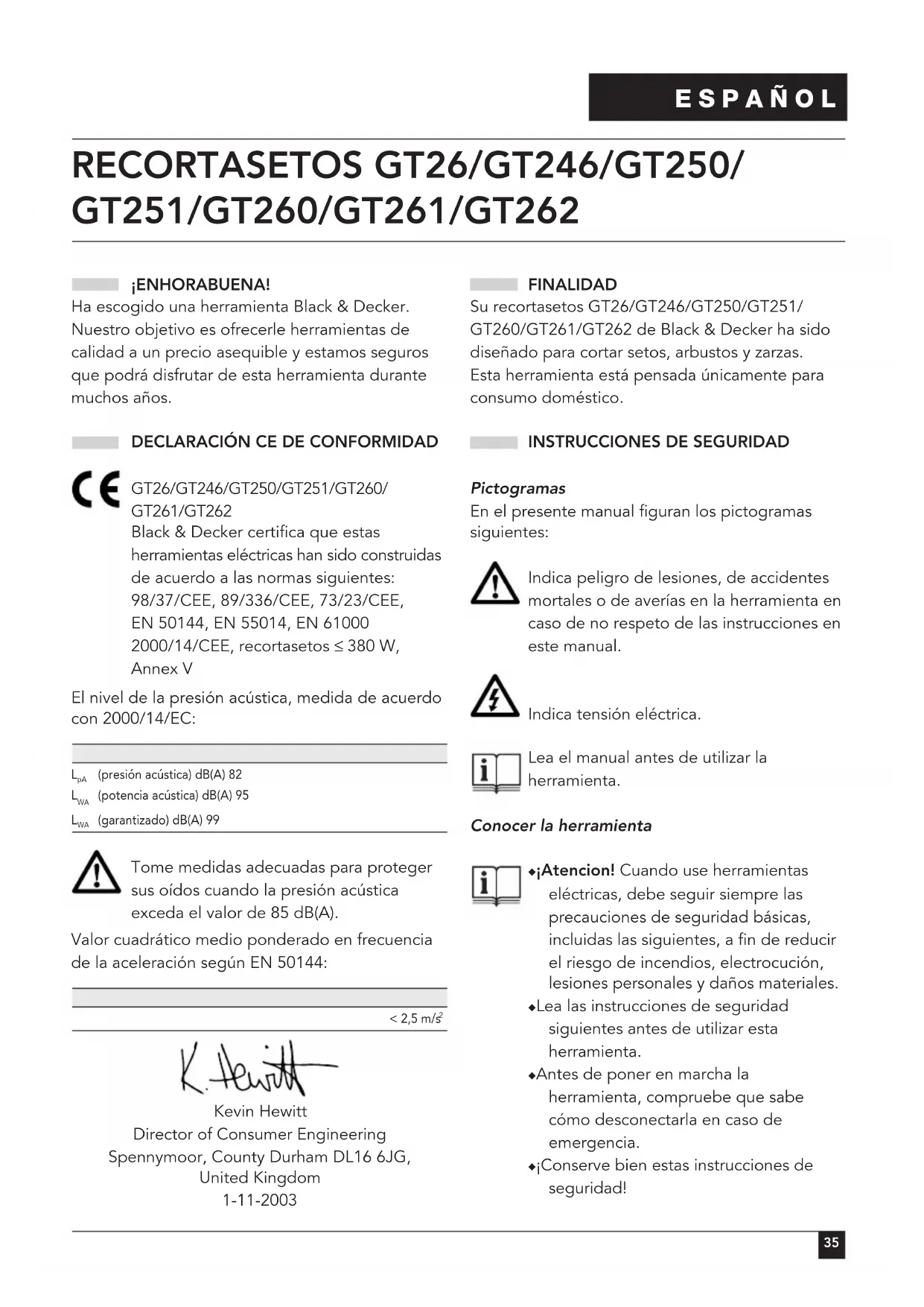 Kevin Hewitt Director of Consumer Engineering Spennymoor, County Durham DL16 6JG, United Kingdom 1-11-2003 FINALIDAD Su recortasetos GT26/GT246/GT250/GT251/ GT260/GT261/GT262 de Black & Decker ha sido diseñado para cortar setos, arbustos y zarzas. Esta herramienta está pensada únicamente para consumo doméstico.