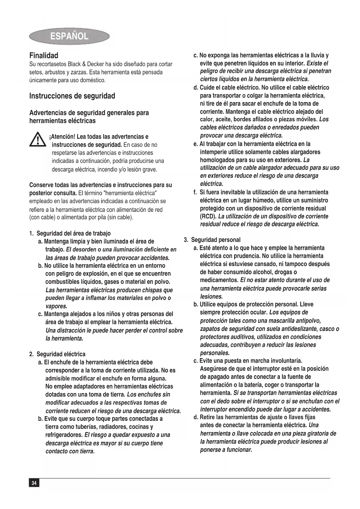 Kevin Hewitt Vice-President Global Engineering Black & Decker Europe, 210 Bath Road, Slough, Berkshire, SL1 3YD Reino Unido 31/03/201040 ESPAÑOL Garantía Black & Decker confía plenamente en la calidad de sus productos y ofrece una garantía extraordinaria. Esta declaración de garantía es una añadido, y en ningún caso un perjuicio para sus derechos estatutarios. La garantía es válida dentro de los territorios de los Estados Miembros de la Unión Europea y de los de la Zona Europea de Libre Comercio. Si un producto Black & Decker resultará defectuoso debido a materiales o mano de obra defectuosos o a la falta de conformidad, Black & Decker garantiza, dentro de los 24 meses de la fecha de compra, la sustitución de las piezas defectuosas, la reparación de los productos sujetos a un desgaste y rotura razonables o la sustitución de tales productos para garantizar al cliente el mínimo de inconvenientes, a menos que: u El producto haya sido utilizado con propósitos comerciales, profesionales o de alquiler; u El producto haya sido sometido a un uso inadecuado o negligente; u El producto haya sufrido daños causados por objetos o sustancias extrañas o accidentes; u Se hayan realizado reparaciones por parte de personas que no sean los servicios de reparación autorizados o personal de servicios de Black & Decker. Para reclamar en garantía, será necesario que presente la prueba de compra al vendedor o al servicio técnico de reparaciones autorizado. Pueden consultar la dirección de su servicio técnico más cercano poniéndose en contacto con la ocina local de Black & Decker en la dirección que se indica en este manual. Como alternativa, se puede consultar en Internet, en la dirección siguiente, la lista de servicios técnicos autorizados e información completa de nuestros servicios de postventa y contactos: www.2helpU.com Visite nuestro sitio web www.blackanddecker.eu para registrar su nuevo producto Black & Decker y mantenerse al día sobre nuestros productos y ofertas especiales. Encontrará información adicional sobre la marca Black & Decker y nuestra gama de productos en www.blackanddecker.eu41 PORTUGUÊS Utilização O seu corta-sebes Black & Decker foi concebido para cortar sebes, arbustos e ramagens. Esta ferramenta destina-se apenas ao doméstico. Instruções de segurança Avisos de segurança gerais para ferramentas eléctricas