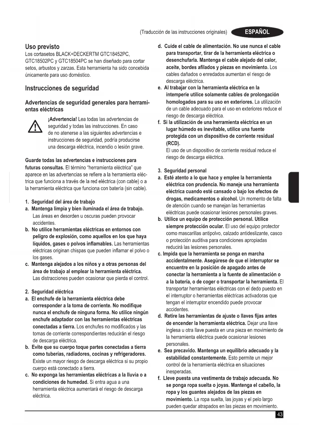 ) dB Estos productos también cumplen con las Directivas 2004/108/CE y 2011/65/UE. Si desea más información, póngase en contacto con Black & Decker en la dirección indicada a continuación o bien consulte la parte posterior de este manual. El abajo rmante es responsable de la elaboración del expediente técnico y realiza esta declaración en nombre de Black & Decker. Ray Laverick Director de Ingeniería Black & Decker Europa, 210 Bath Road, Slough, Berkshire, SL1 3YD Reino Unido 23/10/2015 Garantía Black & Decker confía en la calidad de sus productos y ofrece a los consumidores una garantía de 24 meses a partir de la fecha de compra. Esta garantía es adicional a sus derechos legales y no los menoscaba en modo alguno. La garantía es válida dentro de los territorios de los Estados Miembros de la Unión Europea y del Área de Libre Comercio Europea. Para reclamar la garantía, la reclamación se debe presentar de conformidad con las condiciones de Black & Decker. Ten- drá que adjuntar un justicante de compra al vendedor o al agente técnico autorizado. Las condiciones de la garantía de 2 años de Black & Decker y la ubicación de su agente técnico autorizado más cercano se pueden obtener en Internet en www.2helpU.com o poniéndose en contacto con su ocina local de Black & Decker en la dirección que se indica en este manual. Visite nuestro sitio web www.blackanddecker.co.uk para registrar su nuevo producto Black & Decker y recibir noticias sobre nuevos productos y ofertas especiales.51 (Tradução das instruções originais) PORTUGUÊS Utilização pretendida Os corta-sebes BLACK+DECKERTM GTC18452PC, GTC18502PC e GTC18504PC foram concebidos para cortar sebes, arbustos e rubos. Esta ferramenta destina-se apenas a utilização doméstica. Instruções de segurança Avisos de segurança gerais para ferramentas eléctricas