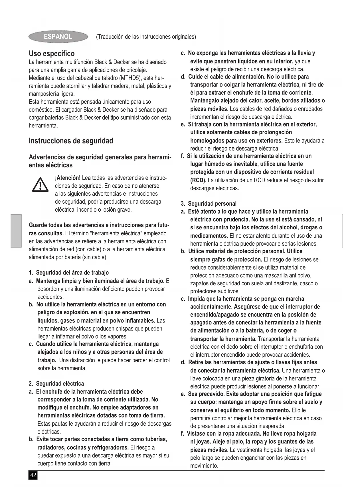 Kevin Hewitt Vicepresidente de Ingeniería global Black & Decker Europe, 210 Bath Road, Slough, Berkshire, SL1 3YD Reino Unido 06/06/2013 Garantía Black & Decker confía plenamente en la calidad de sus pro- ductos y ofrece una garantía extraordinaria. Esta declaración de garantía es un añadido, y en ningún caso un perjuicio para sus derechos legales. La garantía es válida dentro de los territorios de los Estados miembros de la Unión Europea y de los de la Zona Europea de Libre Comercio. Si un producto Black & Decker resultara defectuoso debido a materiales o mano de obra defectuosos o a la falta de confor- midad, Black & Decker garantiza, dentro de los 24 meses de la fecha de compra, la sustitución de las piezas defectuosas, la reparación de los productos sujetos a un desgaste y rotura razonables o la sustitución de tales productos para garantizar al cliente el mínimo de inconvenientes, a menos que: u El producto se haya utilizado con propósitos comerciales, profesionales o de alquiler. u El producto se haya sometido a un uso inadecuado o negligente. u El producto haya sufrido daños causados por objetos o sustancias extrañas o accidentes. u Se hayan realizado reparaciones por parte de personas que no sean del servicio técnico autorizado o personal de servicios de Black & Decker. Para reclamar en garantía, será necesario que presente la prueba de compra al vendedor o al agente de servicio técnico autorizados. Puede consultar la dirección de su agente de servicio técnico más cercano si se pone en contacto con la ocina local de Black & Decker en la dirección que se indica en este manual. Como opción alternativa, puede consultar la lista de los agentes de servicio técnico autorizados de Black & Decker y obtener la información completa de nuestros servi- cios de posventa y los contactos disponibles en la siguiente dirección de Internet: www.2helpU.com Visite el sitio web www.blackanddecker.es para registrar su nuevo producto Black & Decker y estar al día sobre productos y ofertas especiales. Encontrará información adicional sobre la marca Black & Decker y nuestra gama de productos en www.blackanddecker.es.50 (Tradução das instruções originais) PORTUGUÊS Utilização prevista A ferramenta multiusos Black & Decker foi concebida para diversas aplicações de bricolage. Através da cabeça do berbequim (MTHD5), esta ferramenta executa aplicações de aparafusamento e perfuração de madeira, metal, plástico e pedra macia. Esta ferramenta destina-se apenas a utilização doméstica. O carregador Black & Decker foi concebido para carregar bat- erias Black & Decker do tipo fornecido com esta ferramenta. Instruções de segurança Avisos de segurança gerais para ferramentas eléctricas