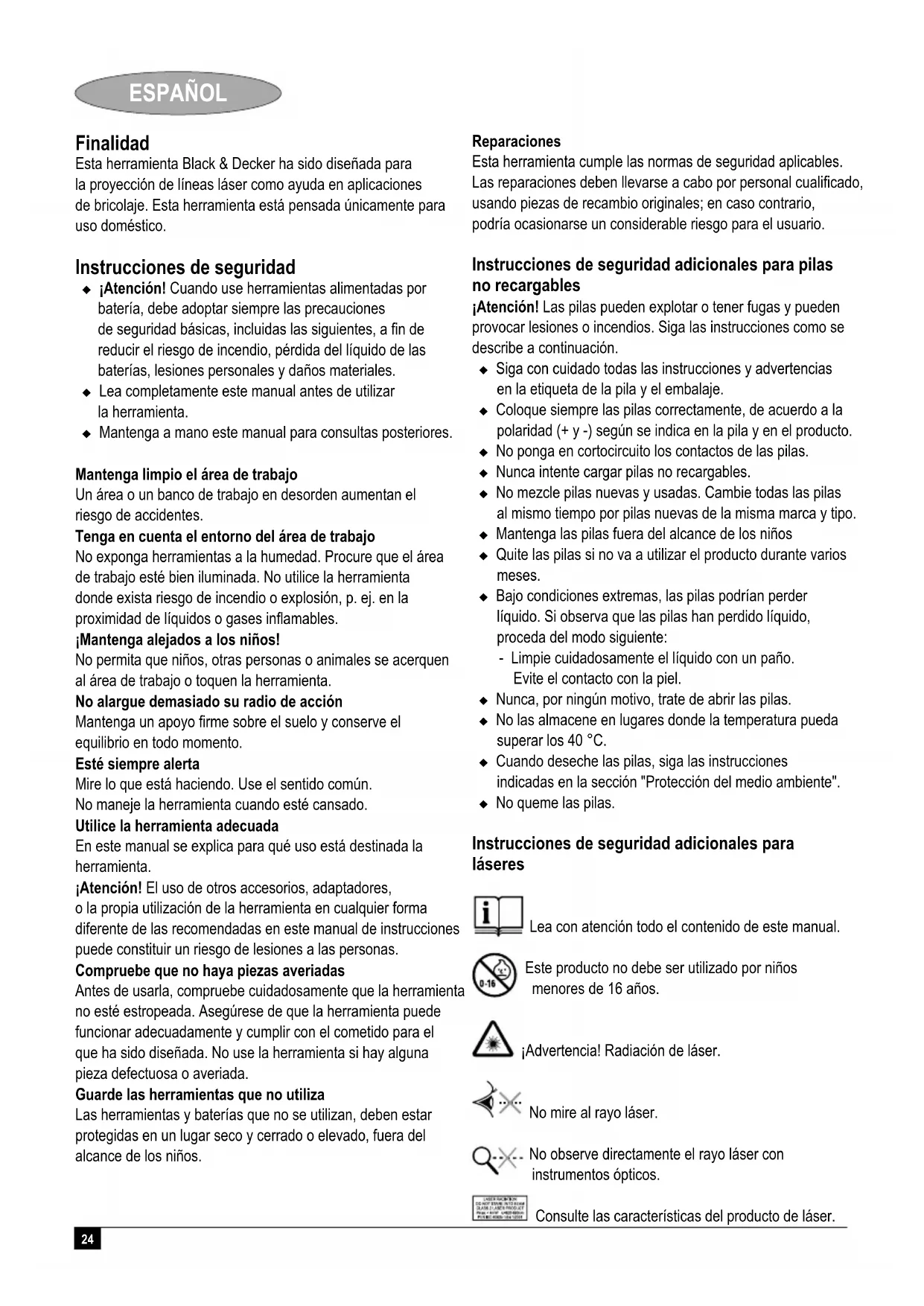 Kevin Hewitt Director of Consumer Engineering Spennymoor, County Durham DL16 6JG, United Kingdom 01-10-2006 Garantie Black & Decker heeft vertrouwen in zijn producten en biedt een uitstekende garantie. Deze garantiebepalingen vormen een aanvulling op uw wettelijke rechten en beperken deze niet. De garantie geldt in de lidstaten van de Europese Unie en de Europese Vrijhandelsassociatie. Mocht uw Black & Decker product binnen 24 maanden na datum van aankoop defect raken tengevolge van materiaal- of constructiefouten, dan garanderen wij de kosteloze vervanging van defecte onderdelen, de reparatie van het product of de vervanging van het product, tenzij: Het product is gebruikt voor handelsdoeleinden, professionele toepassingen of verhuurdoeleinden; Het product onoordeelkundig is gebruikt; Het product is beschadigd door invloeden van buitenaf of door een ongeval; Reparaties zijn uitgevoerd door anderen dan onze servicecentra of Black & Decker personeel. Om een beroep op de garantie te doen, dient u een aankoopbewijs te overhandigen aan de verkoper of een van onze servicecentra. U kunt het adres van het dichtstbijzijnde servicecentrum opvragen via de adressen op de achterzijde van deze handleiding. U kunt ook een lijst van onze servicecentra en meer informatie m.b.t. onze klantenservice vinden op het volgende Internet-adres: www.2helpU.com Meld u aan op onze website www.blackanddecker.nl om te worden geïnformeerd over nieuwe producten en speciale aanbiedingen. Verdere informatie over het merk Black & Decker en onze producten vindt u op www.blackanddecker.nl24 ESPAÑOL Finalidad Esta herramienta Black & Decker ha sido diseñada para la proyección de líneas láser como ayuda en aplicaciones de bricolaje. Esta herramienta está pensada únicamente para uso doméstico. Instrucciones de seguridad ¡Atención! Cuando use herramientas alimentadas por batería, debe adoptar siempre las precauciones de seguridad básicas, incluidas las siguientes, a fin de reducir el riesgo de incendio, pérdida del líquido de las baterías, lesiones personales y daños materiales. Lea completamente este manual antes de utilizar la herramienta. Mantenga a mano este manual para consultas posteriores. Mantenga limpio el área de trabajo Un área o un banco de trabajo en desorden aumentan el riesgo de accidentes. Tenga en cuenta el entorno del área de trabajo No exponga herramientas a la humedad. Procure que el área de trabajo esté bien iluminada. No utilice la herramienta donde exista riesgo de incendio o explosión, p. ej. en la proximidad de líquidos o gases inflamables. ¡Mantenga alejados a los niños! No permita que niños, otras personas o animales se acerquen al área de trabajo o toquen la herramienta. No alargue demasiado su radio de acción Mantenga un apoyo firme sobre el suelo y conserve el equilibrio en todo momento. Esté siempre alerta Mire lo que está haciendo. Use el sentido común. No maneje la herramienta cuando esté cansado. Utilice la herramienta adecuada En este manual se explica para qué uso está destinada la herramienta. ¡Atención! El uso de otros accesorios, adaptadores, o la propia utilización de la herramienta en cualquier forma diferente de las recomendadas en este manual de instrucciones puede constituir un riesgo de lesiones a las personas. Compruebe que no haya piezas averiadas Antes de usarla, compruebe cuidadosamente que la herramienta no esté estropeada. Asegúrese de que la herramienta puede funcionar adecuadamente y cumplir con el cometido para el que ha sido diseñada. No use la herramienta si hay alguna pieza defectuosa o averiada. Guarde las herramientas que no utiliza Las herramientas y baterías que no se utilizan, deben estar protegidas en un lugar seco y cerrado o elevado, fuera del alcance de los niños. Reparaciones Esta herramienta cumple las normas de seguridad aplicables. Las reparaciones deben llevarse a cabo por personal cualificado, usando piezas de recambio originales; en caso contrario, podría ocasionarse un considerable riesgo para el usuario. Instrucciones de seguridad adicionales para pilas no recargables ¡Atención! Las pilas pueden explotar o tener fugas y pueden provocar lesiones o incendios. Siga las instrucciones como se describe a continuación. Siga con cuidado todas las instrucciones y advertencias en la etiqueta de la pila y el embalaje. Coloque siempre las pilas correctamente, de acuerdo a la polaridad (+ y -) según se indica en la pila y en el producto. No ponga en cortocircuito los contactos de las pilas. Nunca intente cargar pilas no recargables. No mezcle pilas nuevas y usadas. Cambie todas las pilas al mismo tiempo por pilas nuevas de la misma marca y tipo. Mantenga las pilas fuera del alcance de los niños Quite las pilas si no va a utilizar el producto durante varios meses. Bajo condiciones extremas, las pilas podrían perder líquido. Si observa que las pilas han perdido líquido, proceda del modo siguiente: - Limpie cuidadosamente el líquido con un paño. Evite el contacto con la piel. Nunca, por ningún motivo, trate de abrir las pilas. No las almacene en lugares donde la temperatura pueda superar los 40 °C. Cuando deseche las pilas, siga las instrucciones indicadas en la sección "Protección del medio ambiente". No queme las pilas. Instrucciones de seguridad adicionales para láseres Lea con atención todo el contenido de este manual. Este producto no debe ser utilizado por niños menores de 16 años. ¡Advertencia! Radiación de láser. No mire al rayo láser. No observe directamente el rayo láser con instrumentos ópticos. Consulte las características del producto de láser.25 ESPAÑOL Este láser pertenece a la clase 2 según la norma IEC 60825-1: Ed 1:2001. No sustituya el diodo del láser por uno de diferente tipo. Si se estropea, haga que lo reparen en un servicio técnico autorizado. No utilice el láser para fines distintos a la proyección de rayos láser. Se ha determinado que la exposición de los ojos a un ra