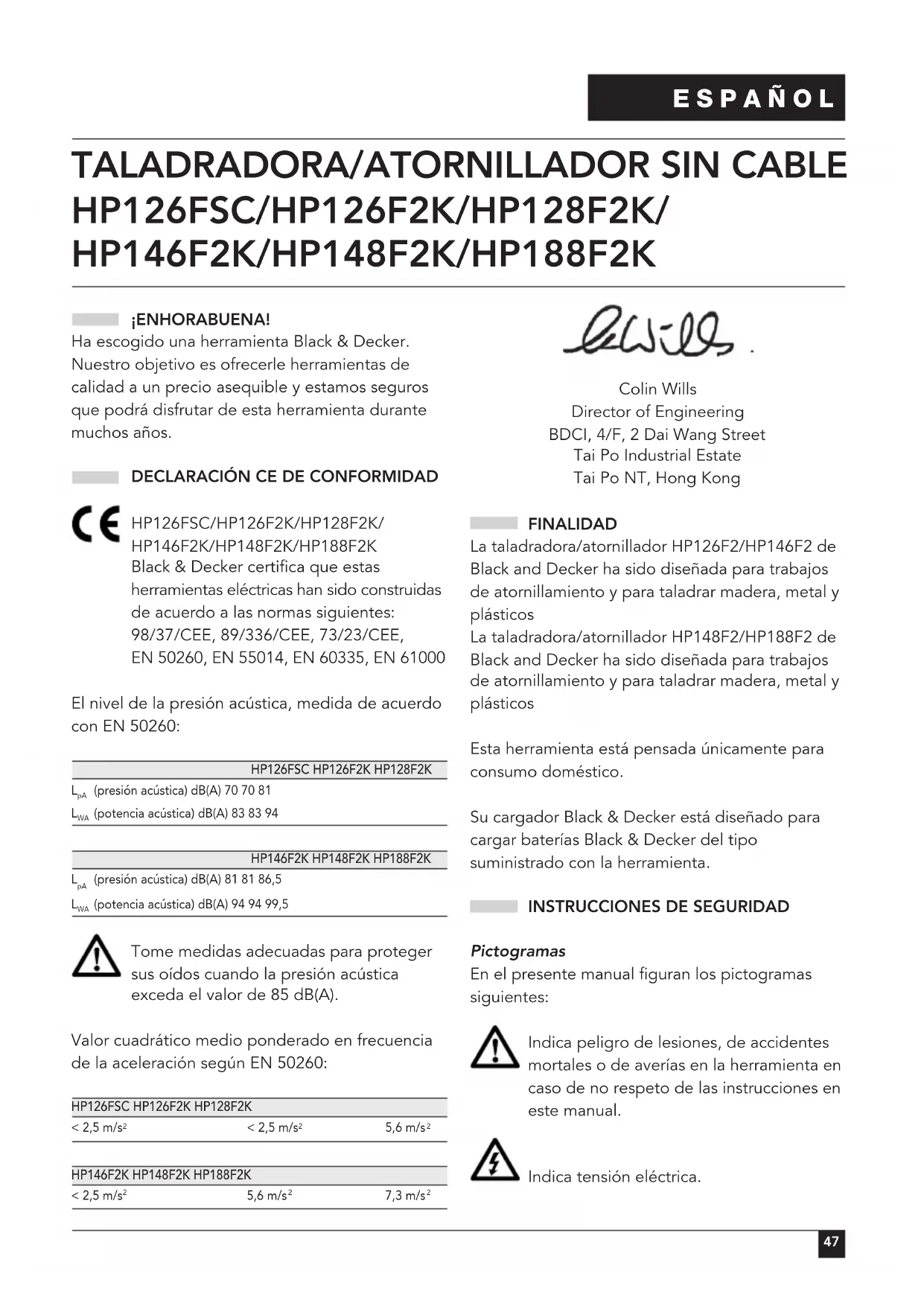 HP126FSC/HP126F2K/HP128F2K/ HP146F2K/HP148F2K/HP188F2K Black & Decker certifica que estas herramientas eléctricas han sido construidas de acuerdo a las normas siguientes: 98/37/CEE, 89/336/CEE, 73/23/CEE, EN 50260, EN 55014, EN 60335, EN 61000 El nivel de la presión acústica, medida de acuerdo con EN 50260: HP126FSC HP126F2K HP128F2K