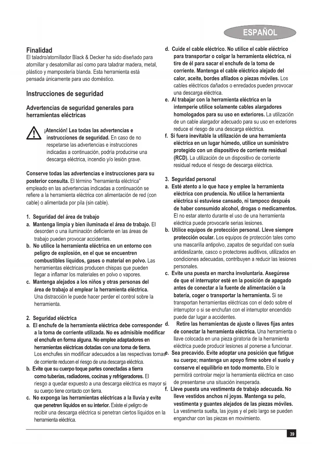 Kevin Hewitt Director de Ingeniería del Consumidor Spennymoor, County Durham DL16 6JG, Reino Unido 23-3-2009 Garantía Black & Decker confía plenamente en la calidad de sus productos y ofrece una garantía extraordinaria. Esta declaración de garantía es una añadido, y en ningún caso un perjuicio para sus derechos estatutarios. La garantía es válida dentro de los territorios de los Estados Miembros de la Unión Europea y de los de la Zona Europea de Libre Comercio. Si un producto Black & Decker resultará defectuoso debido a materiales o mano de obra defectuosos o a la falta de conformidad, Black & Decker garantiza, dentro de los 24 meses de la fecha de compra, la sustitución de las piezas defectuosas, la reparación de los productos sujetos a un desgaste y rotura razonables o la sustitución de tales productos para garantizar al cliente el mínimo de inconvenientes, a menos que: u El producto haya sido utilizado con propósitos comerciales, profesionales o de alquiler; u El producto haya sido sometido a un uso inadecuado o negligente; u El producto haya sufrido daños causados por objetos o sustancias extrañas o accidentes; u Se hayan realizado reparaciones por parte de personas que no sean los servicios de reparación autorizados o personal de servicios de Black & Decker. Para reclamar en garantía, será necesario que presente la prueba de compra al vendedor o al servicio técnico de reparaciones autorizado. Pueden consultar la dirección de su servicio técnico más cercano poniéndose en contacto con la ocina local de Black & Decker en la dirección que se indica en este manual. Como alternativa, se puede consultar en Internet, en la dirección siguiente, la lista de servicios técnicos autorizados e información completa de nuestros servicios de postventa y contactos: www.2helpU.com Visite nuestro sitio web www.blackanddecker.eu para registrar su nuevo producto Black & Decker y mantenerse al día sobre nuestros productos y ofertas especiales. Encontrará información adicional sobre la marca Black & Decker y nuestra gama de productos en www.blackanddecker.eu46 PORTUGUÊS Utilização O berbequim/aparafusador sem o da Black & Decker foi projectado para aparafusar e perfurar madeira, metal, plástico e alvenaria. Esta ferramenta destina-se apenas ao doméstico. Instruções de segurança Avisos de segurança gerais para ferramentas eléctricas