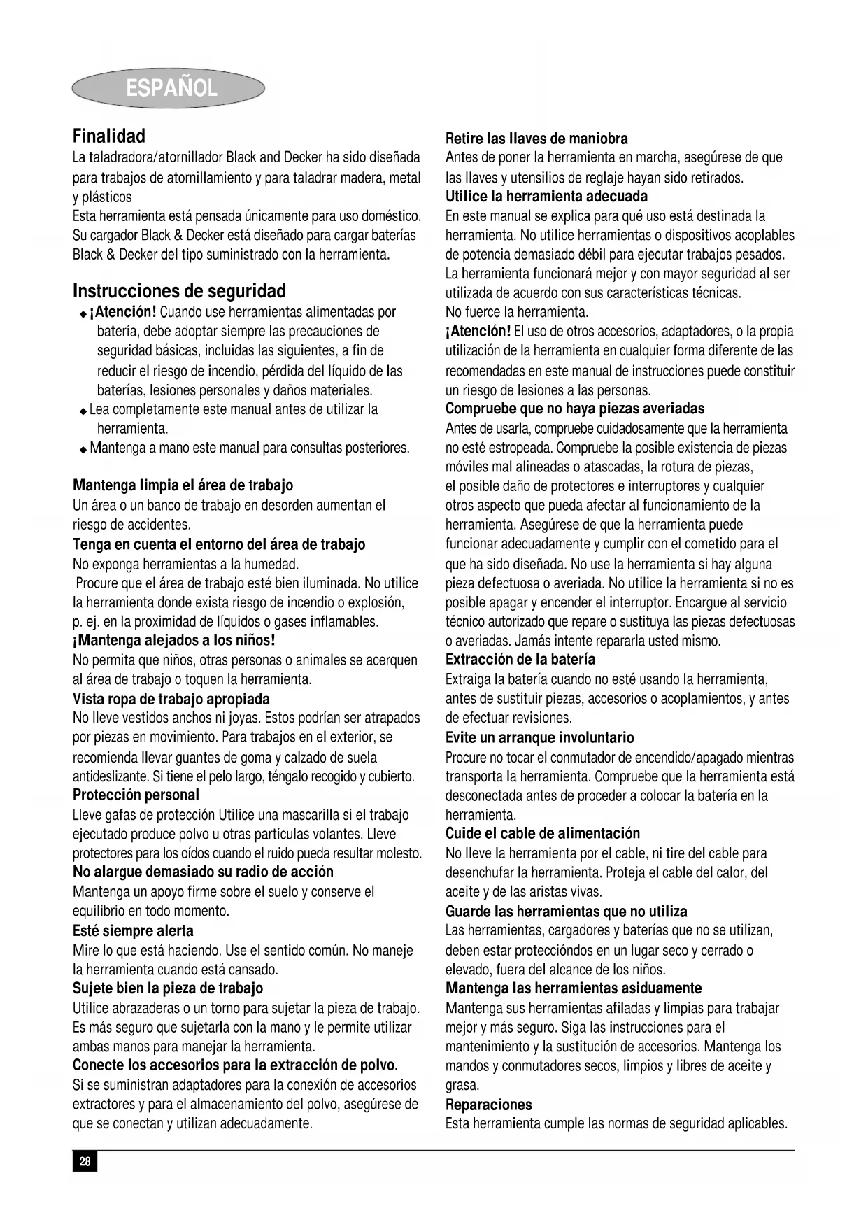 Colin Wills Director of Engineering BDCI, 4/F, 2 Dai Wang Street Tai Po Industrial Estate Tai Po NT, Hong Kong Garantie Black & Decker heeft vertrouwen in zijn producten en biedt een uitstekende garantie. Deze garantiebepalingen vormen een aanvulling op uw wettelijke rechten en beperken deze niet. De garantie geldt in de lidstaten van de Europese Unie en de Europese Vrijhandelsassociatie. Mocht uw Black & Decker product binnen 24 maanden na datum van aankoop defect raken tengevolge van materiaal- of constructiefouten, dan garanderen wij de kosteloze vervanging van defecte onderdelen, de reparatie van het product of de vervanging van het product, tenzij: ◆ Het product is gebruikt voor handelsdoeleinden, professionele toepassingen of verhuurdoeleinden; ◆ Het product onoordeelkundig is gebruikt; ◆ Het product is beschadigd door invloeden van buitenaf of door een ongeval; ◆ Reparaties zijn uitgevoerd door anderen dan onze servicecentra of Black & Decker personeel. Om een beroep op de garantie te doen, dient u een aankoopbewijs te overhandigen aan de verkoper of een van onze servicecentra. U kunt het adres van het dichtstbijzijnde servicecentrum opvragen via de adressen op de achterzijde van deze handleiding. U kunt ook een lijst van onze servicecentra en meer informatie m.b.t. onze klantenservice vinden op het volgende Internet-adres: www.2helpU.com. NEDERLANDS28 ESPAÑOL Finalidad La taladradora/atornillador Black and Decker ha sido diseñada para trabajos de atornillamiento y para taladrar madera, metal y plásticos Esta herramienta está pensada únicamente para uso doméstico. Su cargador Black & Decker está diseñado para cargar baterías Black & Decker del tipo suministrado con la herramienta. Instrucciones de seguridad ◆ ¡Atención! Cuando use herramientas alimentadas por batería, debe adoptar siempre las precauciones de seguridad básicas, incluidas las siguientes, a fin de reducir el riesgo de incendio, pérdida del líquido de las baterías, lesiones personales y daños materiales. ◆ Lea completamente este manual antes de utilizar la herramienta. ◆ Mantenga a mano este manual para consultas posteriores. Mantenga limpia el área de trabajo Un área o un banco de trabajo en desorden aumentan el riesgo de accidentes. Tenga en cuenta el entorno del área de trabajo No exponga herramientas a la humedad. Procure que el área de trabajo esté bien iluminada. No utilice la herramienta donde exista riesgo de incendio o explosión, p. ej. en la proximidad de líquidos o gases inflamables. ¡Mantenga alejados a los niños! No permita que niños, otras personas o animales se acerquen al área de trabajo o toquen la herramienta. Vista ropa de trabajo apropiada No lleve vestidos anchos ni joyas. Estos podrían ser atrapados por piezas en movimiento. Para trabajos en el exterior, se recomienda llevar guantes de goma y calzado de suela antideslizante. Si tiene el pelo largo, téngalo recogido y cubierto. Protección personal Lleve gafas de protección Utilice una mascarilla si el trabajo ejecutado produce polvo u otras partículas volantes. Lleve protectores para los oídos cuando el ruido pueda resultar molesto. No alargue demasiado su radio de acción Mantenga un apoyo firme sobre el suelo y conserve el equilibrio en todo momento. Esté siempre alerta Mire lo que está haciendo. Use el sentido común. No maneje la herramienta cuando está cansado. Sujete bien la pieza de trabajo Utilice abrazaderas o un torno para sujetar la pieza de trabajo. Es más seguro que sujetarla con la mano y le permite utilizar ambas manos para manejar la herramienta. Conecte los accesorios para la extracción de polvo. Si se suministran adaptadores para la conexión de accesorios extractores y para el almacenamiento del polvo, asegúrese de que se conectan y utilizan adecuadamente. Retire las llaves de maniobra Antes de poner la herramienta en marcha, asegúrese de que las llaves y utensilios de reglaje hayan sido retirados. Utilice la herramienta adecuada En este manual se explica para qué uso está destinada la herramienta. No utilice herramientas o dispositivos acoplables de potencia demasiado débil para ejecutar trabajos pesados. La herramienta funcionará mejor y con mayor seguridad al ser utilizada de acuerdo con sus características técnicas. No fuerce la herramienta. ¡Atención! El uso de otros accesorios, adaptadores, o la propia utilización de la herramienta en cualquier forma diferente de las recomendadas en este manual de instrucciones puede constituir un riesgo de lesiones a las personas. Compruebe que no haya piezas averiadas Antes de usarla, compruebe cuidadosamente que la herramienta no esté estropeada. Compruebe la posible existencia de piezas móviles mal alineadas o atascadas, la rotura de piezas, el posible daño de protectores e interruptores y cualquier otros aspecto que pueda afectar al funcionamiento de la herramienta. Asegúrese de que la herramienta puede funcionar adecuadamente y cumplir con el cometido para el que ha sido diseñada. No use la herramienta si hay alguna pieza defectuosa o averiada. No utilice la herramienta si no es posible apagar y encender el interruptor. Encargue al servicio técnico autorizado que repare o sustituya las piezas defectuosas o averiadas. Jamás intente repararla usted mismo. Extracción de la batería Extraiga la batería cuando no esté usando la herramienta, antes de sustituir piezas, accesorios o acoplamientos, y antes de efectuar revisiones. Evite un arranque involuntario Procure no tocar el conmutador de encendido/apagado mientras transporta la herramienta. Compruebe que la herramienta está desconectada antes de proceder a colocar la batería en la herramienta. Cuide el cable de alimentación No lleve la herramienta por el cable, ni tire del cable para desenchufar la herramienta. Proteja el cable del calor, del aceite y de las aristas vivas. Guarde las herramientas que no utiliza Las herramientas, cargadores y baterías que no se