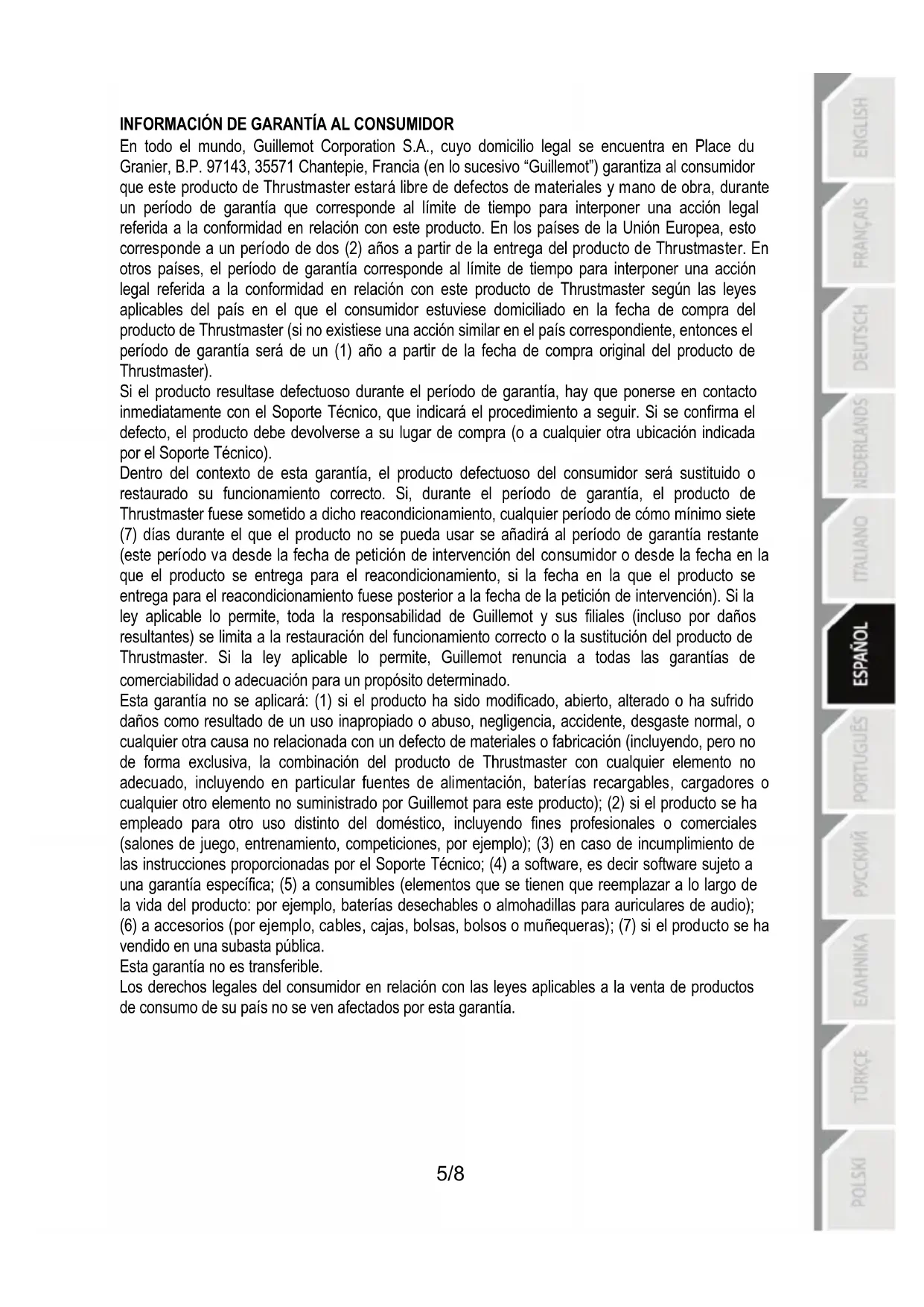 INFORMACIÓN DE GARANTÍA AL CONSUMIDOR En todo el mundo, Guillemot Corporation S.A., cuyo domicilio legal se encuentra en Place du Granier, B.P. 97143, 35571 Chantepie, Francia (en lo sucesivo “Guillemot”) garantiza al consumidor que este producto de Thrustmaster estará libre de defectos de materiales y mano de obra, durante un período de garantía que corresponde al límite de tiempo para interponer una acción legal referida a la conformidad en relación con este producto. En los países de la Unión Europea, esto corresponde a un período de dos (2) años a partir de la entrega del producto de Thrustmaster. En otros países, el período de garantía corresponde al límite de tiempo para interponer una acción legal referida a la conformidad en relación con este producto de Thrustmaster según las leyes aplicables del país en el que el consumidor estuviese domiciliado en la fecha de compra del producto de Thrustmaster (si no existiese una acción similar en el país correspondiente, entonces el período de garantía será de un (1) año a partir de la fecha de compra original del producto de Thrustmaster). Si el producto resultase defectuoso durante el período de garantía, hay que ponerse en contacto inmediatamente con el Soporte Técnico, que indicará el procedimiento a seguir. Si se confirma el defecto, el producto debe devolverse a su lugar de compra (o a cualquier otra ubicación indicada por el Soporte Técnico). Dentro del contexto de esta garantía, el producto defectuoso del consumidor será sustituido o restaurado su funcionamiento correcto. Si, durante el período de garantía, el producto de Thrustmaster fuese sometido a dicho reacondicionamiento, cualquier período de cómo mínimo siete (7) días durante el que el producto no se pueda usar se añadirá al período de garantía restante (este período va desde la fecha de petición de intervención del consumidor o desde la fecha en la que el producto se entrega para el reacondicionamiento, si la fecha en la que el producto se entrega para el reacondicionamiento fuese posterior a la fecha de la petición de intervención). Si la ley aplicable lo permite, toda la responsabilidad de Guillemot y sus filiales (incluso por daños resultantes) se limita a la restauración del funcionamiento correcto o la sustitución del producto de Thrustmaster. Si la ley aplicable lo permite, Guillemot renuncia a todas las garantías de comerciabilidad o adecuación para un propósito determinado. Esta garantía no se aplicará: (1) si el producto ha sido modificado, abierto, alterado o ha sufrido daños como resultado de un uso inapropiado o abuso, negligencia, accidente, desgaste normal, o cualquier otra causa no relacionada con un defecto de materiales o fabricación (incluyendo, pero no de forma exclusiva, la combinación del producto de Thrustmaster con cualquier elemento no adecuado, incluyendo en particular fuentes de alimentación, baterías recargables, cargadores o cualquier otro elemento no suministrado por Guillemot para este producto); (2) si el producto se ha empleado para otro uso distinto del doméstico, incluyendo fines profesionales o comerciales (salones de juego, entrenamiento, competiciones, por ejemplo); (3) en caso de incumplimiento de las instrucciones proporcionadas por el Soporte Técnico; (4) a software, es decir software sujeto a una garantía específica; (5) a consumibles (elementos que se tienen que reemplazar a lo largo de la vida del producto: por ejemplo, baterías desechables o almohadillas para auriculares de audio); (6) a accesorios (por ejemplo, cables, cajas, bolsas, bolsos o muñequeras); (7) si el producto se ha vendido en una subasta pública. Esta garantía no es transferible. Los derechos legales del consumidor en relación con las leyes aplicables a la venta de productos de consumo de su país no se ven afectados por esta garantía.6/8 Provisiones de garantía adicionales Durante el período de garantía, Guillemot no proporcionará, en principio, ninguna pieza de repuesto, ya que el Soporte Técnico es el único autorizado para abrir y/o reacondicionar los productos de Thrustmaster (con la excepción de los procedimientos de reacondicionamiento que el Soporte técnico puede solicitar que lleve a cabo el consumidor, mediante instrucciones por escrito – por ejemplo, debido a la simplicidad y la falta de confidencialidad del proceso de reacondicionamiento – y suministrando al consumidor las piezas de repuesto necesarias, si hiciese falta). Debido a sus ciclos de innovación y para proteger su know-how y secretos comerciales, Guillemot no proporcionará, en principio, ninguna pieza de repuesto ni instrucciones de reacondicionamiento para los productos de Thrustmaster cuyo período de garantía haya vencido. En los Estados Unidos de América y en Canadá, esta garantía está limitada al mecanismo interno del producto y al alojamiento externo. En ningún caso, Guillemot ni sus filiales serán responsables ante terceros por daños resultantes o fortuitos resultado del incumplimiento de cualquier garantía expresa o implícita. En algunos estados o provincias no se permite la limitación de la duración de una garantía implícita ni la exclusión o limitación de responsabilidad por daños resultantes o fortuitos, por lo que las limitaciones o exclusiones anteriores pueden no ser aplicables. Esta garantía ofrece derechos legales específicos al consumidor, que también puede tener otros derechos que pueden variar de un estado a otro o de una provincia a otra. Responsabilidad Si la ley aplicable lo permite, Guillemot Corporation S.A. (en lo sucesivo “Guillemot”) y sus filiales renuncian a toda responsabilidad por los daños causados por uno o más de los siguientes motivos: (1) el producto ha sido modificado, abierto o alterado; (2) incumplimiento de las instrucciones de montaje; (3) uso inapropiado o abuso, negligencia, accidente (un impacto, por ejemplo); (4) desgaste normal; (5) el 