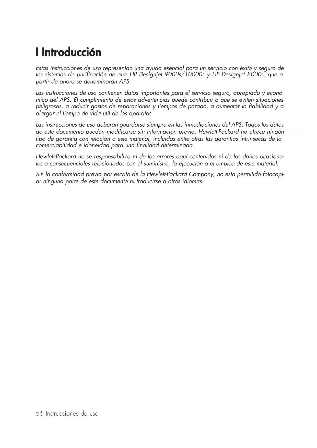 60 kg 95 kg 56 dB(A) 63 dB(A) Filterklasse F 5 Filterklasse F 5 16 kg 2 x 16 kg55 Sistema dde ppurificación dde aaire HHP DDesignjet 99000s/10000s Sistema dde ppurificación dde aaire HHP DDesignjet 88000s Instrucciones dde uuso56 Instrucciones de uso I Introducción Estas instrucciones de uso representan una ayuda esencial para un servicio con éxito y seguro de los sistemas de purificación de aire HP Designjet 9000s/10000s y HP Designjet 8000s, que a partir de ahora se denominarán APS. Las instrucciones de uso contienen datos importantes para el servicio seguro, apropiado y econó- mico del APS. El cumplimiento de estas advertencias puede contribuir a que se eviten situaciones peligrosas, a reducir gastos de reparaciones y tiempos de parada, a aumentar la fiabilidad y a alargar el tiempo de vida útil de los aparatos. Las instrucciones de uso deberán guardarse siempre en las inmediaciones del APS. Todos los datos de este documento pueden modificarse sin información previa. Hewlett-Packard no ofrece ningún tipo de garantía con relación a este material, incluidas entre otras las garantías intrínsecas de la comerciabilidad e idoneidad para una finalidad determinada. Hewlett-Packard no se responsabiliza ni de los errores aquí contenidos ni de los daños ocasiona- les o consecuenciales relacionados con el suministro, la ejecución o el empleo de este material. Sin la conformidad previa por escrito de la Hewlett-Packard Company, no está permitido fotocopi- ar ninguna parte de este documento ni traducirse a otros idiomas.57HP Air Purifier System II Descripción ddel pproducto Sistema dde ppurificación dde aaire HHP DDesignjet 88000s Sistema dde ppurificación dde aaire HHP DDesignjet 99000s/ 10000s 1 Display, teclado de membrana 2 Cubierta de la carcasa 3 Cuerpo del filtro 4 Compuerta de mantenimiento del cuerpo del filtro 5 Carcasa del ventilador 6 Cubierta de ventilador y electrónica 7 Amortiguador del sonido 8 Roldana pivotante con freno 9 Roldana pivotante 10 Tubuladura de aspiración