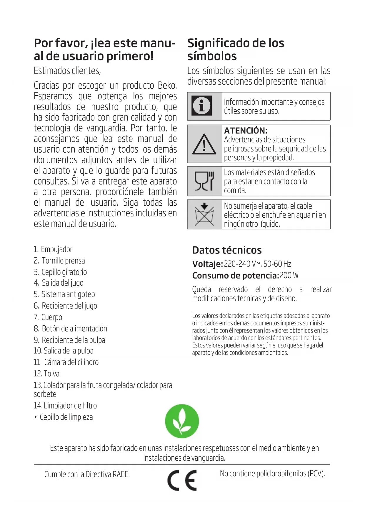 ATENCIÓN: Advertencias de situaciones peligrosas sobre la seguridad de las personas y la propiedad. Los materiales están diseñados para estar en contacto con la comida. No sumerja el aparato, el cable eléctrico o el enchufe en agua ni en ningún otro líquido. Este aparato ha sdo fabrcado en unas nstalacones respetuosas con el medo ambente y en nstalacones de vanguarda. Cumple con la Drectva RAEE. No contene polclorobfenlos (PCV).