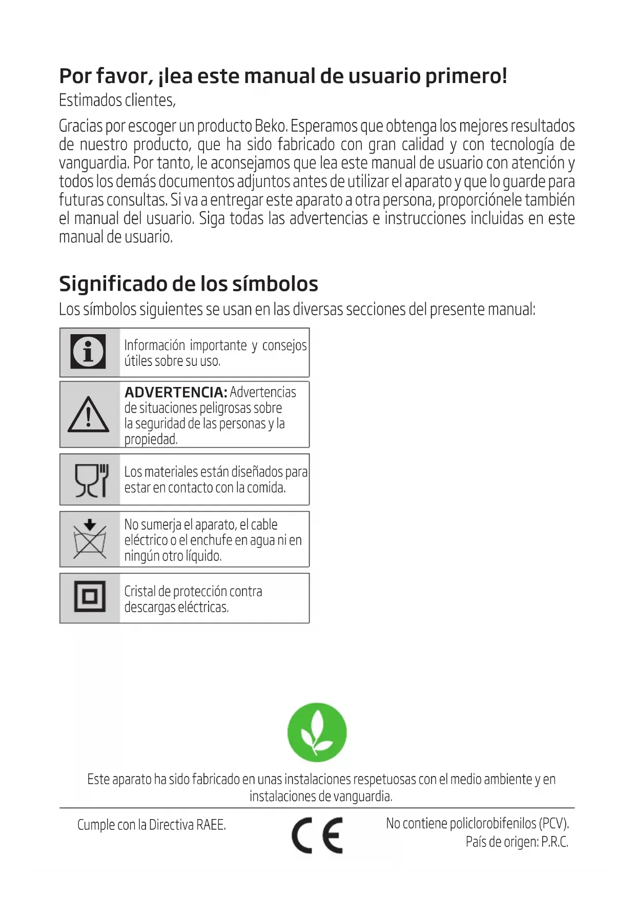 - Cihazın düşürülmesi durumunda cihaz çalışmayabilir veya kalıcı hasar oluşabilir.Por favor, ¡lea este manual de usuario primero! Estmados clentes, Gracas por escoger un producto Beko. Esperamos que obtenga los mejores resultados de nuestro producto, que ha sdo fabrcado con gran caldad y con tecnología de vanguarda. Por tanto, le aconsejamos que lea este manual de usuaro con atencón y todos los demás documentos adjuntos antes de utlzar el aparato y que lo guarde para futuras consultas. S va a entregar este aparato a otra persona, proporcónele tambén el manual del usuaro. Sga todas las advertencas e nstruccones ncludas en este manual de usuaro. Significado de los símbolos Los símbolos sguentes se usan en las dversas seccones del presente manual: