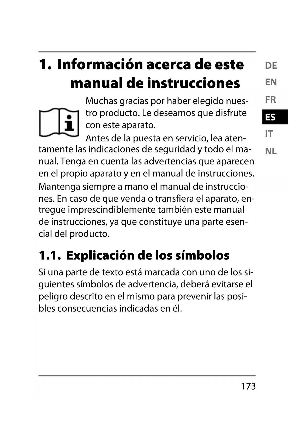 manual de instrucciones Muchas gracias por haber elegido nues- tro producto. Le deseamos que disfrute con este aparato. Antes de la puesta en servicio, lea aten- tamente las indicaciones de seguridad y todo el ma- nual. Tenga en cuenta las advertencias que aparecen en el propio aparato y en el manual de instrucciones. Mantenga siempre a mano el manual de instruccio- nes. En caso de que venda o transfiera el aparato, en- tregue imprescindiblemente también este manual de instrucciones, ya que constituye una parte esen- cial del producto. 1.1. Explicación de los símbolos Si una parte de texto está marcada con uno de los si- guientes símbolos de advertencia, deberá evitarse el peligro descrito en el mismo para prevenir las posi- bles consecuencias indicadas en él.174 ¡PELIGRO! Advertencia de peligro de muer- te inminente. ¡ADVERTENCIA! Advertencia de posible peligro de muerte o de lesiones graves irreversibles. ¡ATENCIÓN! Advertencia de posibles lesiones de grado medio o leve. ¡AVISO! Respete las indicaciones para evi- tar daños materiales. Información más detallada para el uso del aparato.175