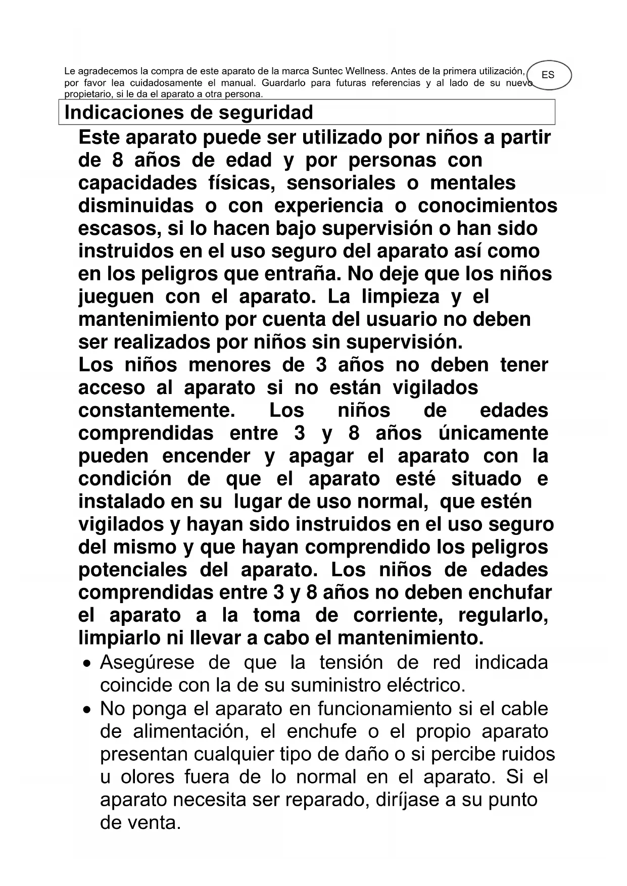 Monsun 6000 black SUNTEC WELLNESS GMBH / HOLZSTRASSE 2 / 40 221 DÜSSELDORF / GERMANYLe agradecemos la compra de este aparato de la marca Suntec Wellness. Antes de la primera utilización, por favor lea cuidadosamente el manual. Guardarlo para futuras referencias y al lado de su nuevo propietario, si le da el aparato a otra persona. Indicaciones de seguridad Este aparato puede ser utilizado por niños a partir de 8 años de edad y por personas con capacidades físicas, sensoriales o mentales disminuidas o con experiencia o conocimientos escasos, si lo hacen bajo supervisión o han sido instruidos en el uso seguro del aparato así como en los peligros que entraña. No deje que los niños jueguen con el aparato. La limpieza y el mantenimiento por cuenta del usuario no deben ser realizados por niños sin supervisión. Los niños menores de 3 años no deben tener acceso al aparato si no están vigilados constantemente. Los niños de edades comprendidas entre 3 y 8 años únicamente pueden encender y apagar el aparato con la condición de que el aparato esté situado e instalado en su lugar de uso normal, que estén vigilados y hayan sido instruidos en el uso seguro del mismo y que hayan comprendido los peligros potenciales del aparato. Los niños de edades comprendidas entre 3 y 8 años no deben enchufar el aparato a la toma de corriente, regularlo, limpiarlo ni llevar a cabo el mantenimiento.