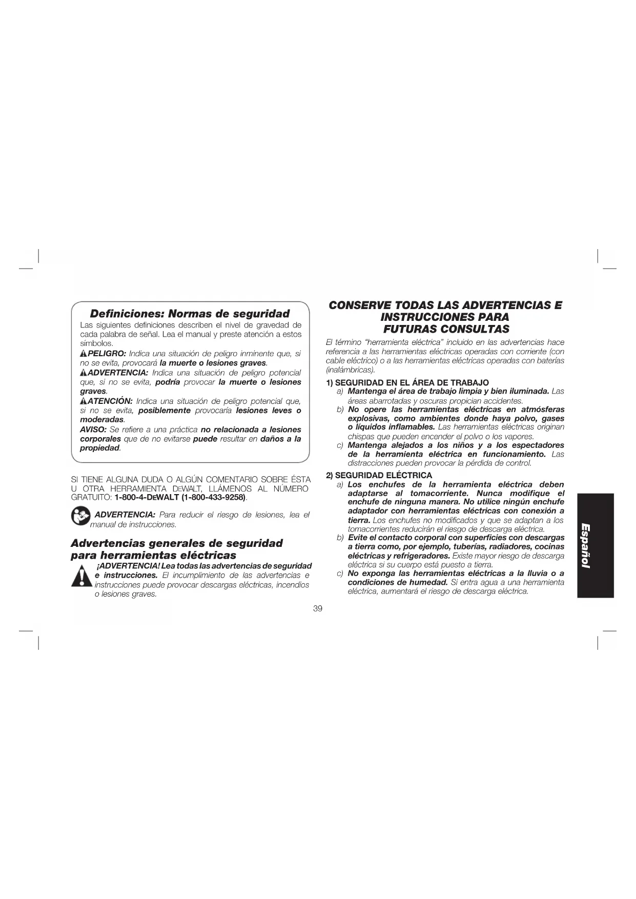 WALT (1-800-433-9258). ADVERTENCIA: Para reducir el riesgo de lesiones, lea el manual de instrucciones. Advertencias generales de seguridad para herramientas eléctricas ¡ADVERTENCIA! Lea todas las advertencias de seguridad e instrucciones. El incumplimiento de las advertencias e instrucciones puede provocar descargas eléctricas, incendios o lesiones graves.