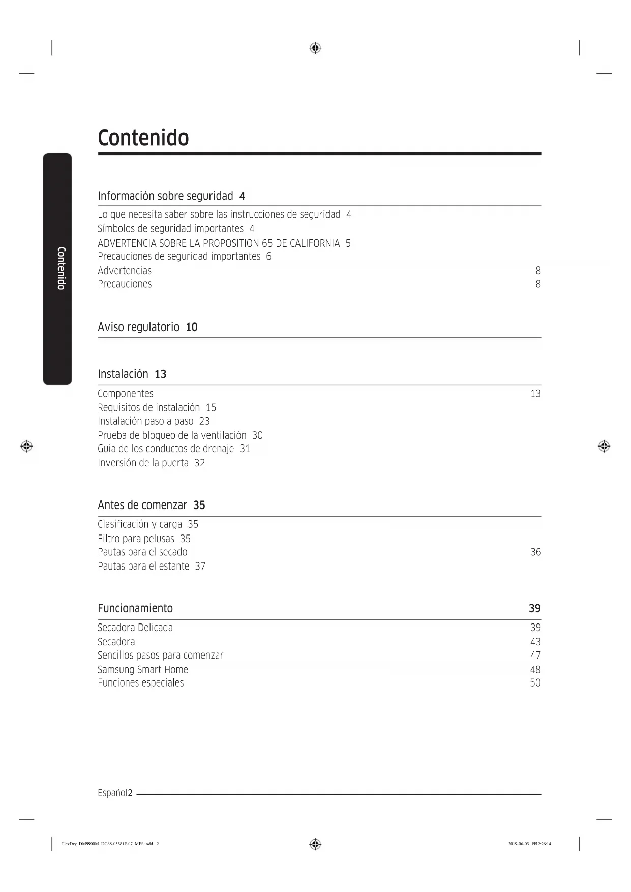 Precauciones de seguridad importantes 6 Advertencias 8 Precauciones 8 Aviso regulatorio 10 Instalación 13 Componentes 13 Requisitos de instalación 15 Instalación paso a paso 23 Prueba de bloqueo de la ventilación 30 Guía de los conductos de drenaje 31 Inversión de la puerta 32 Antes de comenzar 35 Clasicación y carga 35 Filtro para pelusas 35 Pautas para el secado 36 Pautas para el estante 37 Funcionamiento 39 Secadora Delicada 39 Secadora 43 Sencillos pasos para comenzar 47 Samsung Smart Home 48 Funciones especiales 50 FlexDry_DM9900M_DC68-03381F-07_MES.indd 2 2019-06-03 2:26:14Contenido Español 3 Mantenimiento 52 Limpieza general e instrucciones de mantenimiento 52 Secadora Delicada 54 Secadora 55 Solución de problemas 56 Vericaciones 56 Samsung Smart Home 59 Códigos de información 60 Especicaciones 62 Tabla de indicaciones sobre telas 62 Protección del medio ambiente 63 Hoja de especicaciones 64 Tabla de ciclos 65 FlexDry_DM9900M_DC68-03381F-07_MES.indd 3 2019-06-03 2:26:14CONSERVE ESTAS INSTRUCCIONES Información sobre seguridad Español4 Información sobre seguridad Felicitaciones por la compra de la nueva secadora Samsung. Este manual contiene información importante acerca de la instalación, el uso y el cuidado del electrodoméstico. Lea detenidamente estas instrucciones a n de aprovechar al máximo los múltiples benecios y funciones de la secadora. Lo que necesita saber sobre las instrucciones de seguridad Lea este manual detenidamente para aprender a utilizar con seguridad y ecacia todas las características y funciones de su nuevo electrodoméstico. Conserve el manual en un lugar seguro cerca del electrodoméstico para consultas futuras. Utilice este electrodoméstico solo para el propósito para el que fue destinado como se describe en este manual. Las advertencias y las instrucciones de seguridad importantes de este manual no cubren todas las posibles condiciones y situaciones que pueden ocurrir. Es su responsabilidad actuar con sentido común, precaución y cuidado cuando instale, realice el mantenimiento y ponga en funcionamiento la secadora. Puesto que las siguientes instrucciones de funcionamiento sirven para varios modelos, las características de su secadora pueden diferir ligeramente de las que se describen en este manual y es posible que no todas las señales de advertencia sean aplicables. Si tiene alguna consulta o duda, comuníquese con el centro de servicio más cercano o busque ayuda e información en línea en www.samsung.com. Símbolos de seguridad importantes Los iconos y las señales incluidas en este manual del usuario signican lo siguiente: ADVERTENCIA Peligros o prácticas inseguras que podrían causar lesiones físicas graves o la muerte y/o daños materiales. PRECAUCIÓN Peligros o prácticas inseguras que podrían causar lesiones físicas y/o daños materiales. NOTA Indica que existe el riesgo de lesiones físicas o daños materiales. Estas señales de advertencia tienen por objeto evitar que usted u otras personas sufran lesiones. Siga las instrucciones completamente. Después de leer este manual, guárdelo en un lugar seguro para consultas futuras. Lea todas las instrucciones antes de usar el electrodoméstico. Al igual que con cualquier equipo que usa electricidad y piezas movibles, existen riesgos potenciales. Para usar este electrodoméstico en forma segura, familiarícese con su funcionamiento y manéjelo con cuidado cuando lo use. FlexDry_DM9900M_DC68-03381F-07_MES.indd 4 2019-06-03 2:26:15CONSERVE ESTAS INSTRUCCIONES Información sobre seguridad