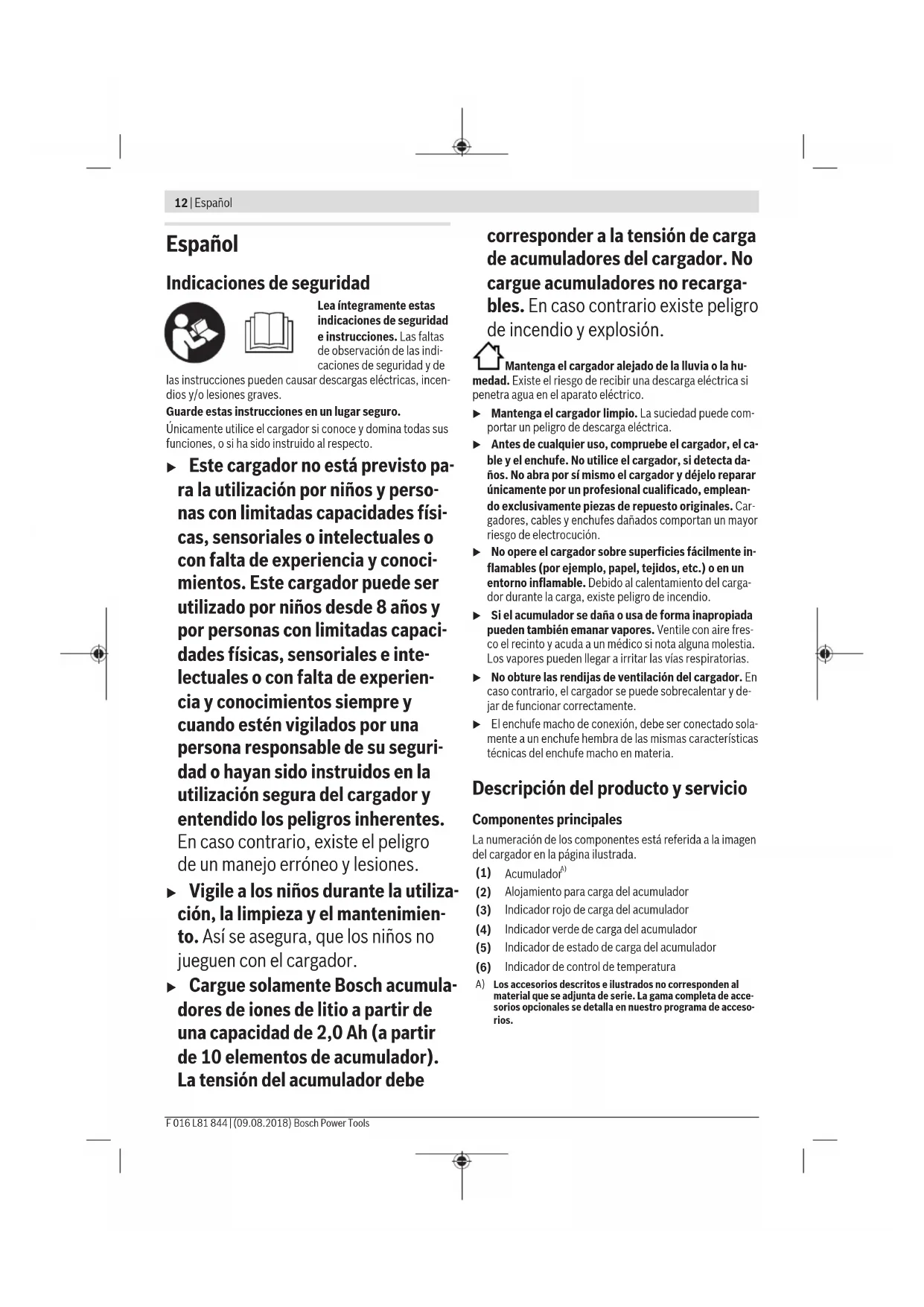 Tensión de carga del acumu- lador (detección automática de tensión) V 36 Corriente de carga A 2,0 Margen admisible de la tem- peratura de carga °C 0 – 45 Tiempo de carga aprox. para capacidad de acumulador in- dicada – 2,0 Ah min 65 – 4,0 Ah min 125 – 6,0 Ah min 185 Nº de celdas 10 – 30 Peso según EPTA‑Procedure 01:2014 kg 0,55 Clase de protección / II Operación Puesta en marcha u ¡Observe la tensión de red! La tensión de alimentación deberá coincidir con aquella indicada en la placa de ca- racterísticas del cargador. Los cargadores marcados con 230V pueden funcionar también a 220V. Proceso de carga El proceso de carga comienza tan pronto como el enchufe de red del cargador se enchufa en la caja de enchufe y el acu- mulador (1) se encaja en el compartimiento de carga (2). Gracias al inteligente procedimiento de carga utilizado, el es- tado de carga del acumulador es detectado automáticamen- te, y es recargado con la corriente de carga óptima de acuer- do a su temperatura y tensión. Con ello se protege al acumulador, el cual se mantiene siem- pre completamente cargado, al conservarlo en el cargador. Significado de los indicadores Luz intermitente del indicador verde de carga del acumulador (4) El proceso de carga rápida se señaliza median- te un parpadeo del indicador de carga del acu- mulador verde (4). El acumulador se puede sacar y utilizar en todo momento. Indicación: El proceso de carga rápida sólo es posible, si la temperatura del acumulador se encuentra en el margen de temperatura de carga admisible, véase capítulo "Datos técni- cos". Luz permanente del indicador verde de carga del acumulador (4) La luz permanente del indicador verde de car- ga del acumulador (4) señaliza que el acumula- dor está totalmente cargado. Seguidamente puede retirarse el acumulador e utilizarse in- mediatamente. Sin el acumulador encajado, la luz permanente del indicador de carga del acumulador (4) señaliza que enchufe de red es- tá encajado en la caja de enchufe y el cargador está listo para el funcionamiento. Luz permanente del indicador rojo de carga del acumulador (3) La luz permanente del indicador rojo de carga del acumulador (3) señaliza que la temperatu- ra del acumulador se encuentra fuera del mar- gen de temperatura de carga admisible, véase capítulo "Datos técnicos. Tan pronto se ha alcanzado el mar- gen de temperatura admisible, comienza el proceso de car- ga. Luz intermitente del indicador rojo de carga del acumulador (3) La luz intermitente del indicador rojo de carga del acumulador (3) señaliza otra perturbación del proceso de carga, véase apartado "Fallos – causas y remedio“. Fallos - Causas y remedio Causa Remedio El indicador rojo de carga del acumulador (3) parpadea No es posible realizar el proceso de carga Acumulador sin colocar, o mal colocado Asentar correctamente el acumulador sobre el carga- dor Contactos sucios del acumu- lador Limpiar los contactos del acumulador; p.ej. metiéndo- lo y sacándolo repetidamen- te, o bien, sustituir el acumu- lador Acumulador defectuoso Sustituir el acumulador Los indicador de carga del acumulador (4) o (3) no se iluminan El enchufe de red del carga- dor no está correctamente conectado Introducir completamente el enchufe en la toma de co- rriente Toma de corriente, cable de red o cargador defectuoso Verifique la tensión de red, y si fuese preciso, acuda a un servicio técnico autorizado para herramientas eléctricas Bosch para hacer revisar el cargador Español | 13 Bosch Power Tools F 016 L81 844 | (09.08.2018)14 | Português F 016 L81 844 | (09.08.2018) Bosch Power Tools Instrucciones para la operación En caso de efectuar recargas continuas o muy seguidas pue- de que llegue a calentarse el cargador. Sin embargo, esto no tiene inconvenientes y no indica un defecto técnico del car- gador. Si después de una recarga, el tiempo de funcionamiento del acumulador fuese muy reducido, ello es señal de que éste está agotado y deberá sustituirse. Mantenimiento y servicio Mantenimiento y limpieza La sustitución de un cable de conexión deteriorado deberá ser realizada por Bosch o por un servicio técnico autorizado para herramientas eléctricas Bosch con el fin de garantizar la seguridad del aparato. Servicio técnico y atención al cliente www.bosch-garden.com Para cualquier consulta o pedido de piezas de repuesto es imprescindible indicar el nº de artículo de 10dígitos que fi- gura en la placa de características del producto. España Robert Bosch España S.L.U. Departamento de ventas Herramientas Eléctricas C/Hermanos García Noblejas, 19 28037 Madrid Para efectuar su pedido online de recambios o pedir la reco- gida para la reparación de su máquina, entre en la página www.herramientasbosch.net. Tel. Asesoramiento al cliente: 902 531 553 Fax: 902 531554 Argentina Robert Bosch Argentina S.A. Calle Blanco Encalada 250 – San Isidro Código Postal B1642AMQ Ciudad Autónoma de Buenos Aires Tel.: (54) 11 5296 5200 E-Mail: herramientas.bosch@ar.bosch.com www.argentina.bosch.com.ar Chile Robert Bosch S.A. Calle El Cacique 0258 Providencia – Santiago de Chile Buzón Postal 7750000 Tel.: (56) 02 782 0200 www.bosch.cl Ecuador Robert Bosch Sociedad Anónima Av. Rodrigo Chávez Gonzalez Parque Empresarial Colón Edif. Coloncorp Piso 1 Local 101-102, Guayaquil Tel.: (593) 4 220 4000 E-mail: ventas@bosch.com.ec www.bosch.ec México Robert Bosch S. de R.L. de C.V. Calle Robert Bosch No. 405 C.P. 50071 Zona Industrial, Toluca - Estado de México Tel.: (52) 55 528430-62 Tel.: 800 6271286 www.bosch-herramientas.com.mx Perú Robert Bosch S.A.C. Av. Primavera 781 Piso 2, Urbanización Chacarilla San Borja Lima Tel.: (51) 1 706 1100 www.bosch.com.pe Venezuela Robert Bosch S.A. Calle Vargas con Buen Pastor, Edif. Alba, P-1, Boleita Norte, Caracas 1071 Tel.: (58) 212 207-4511 www.boschherramientas.com.ve Eliminación Los cargadores, accesorios y embalajes deberán someterse a un proceso de recuperación 