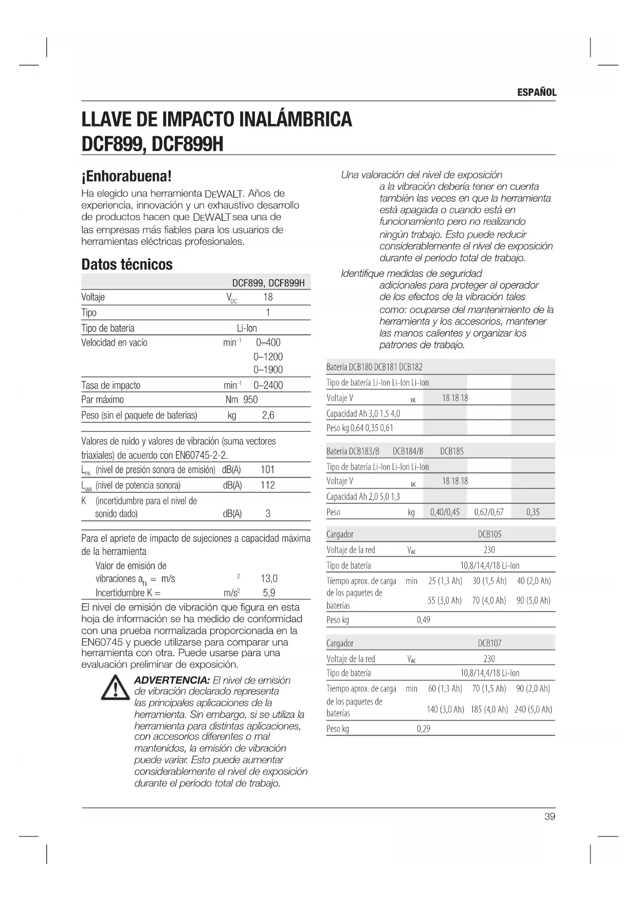 Los DCF899 y DCF899H funcionan con paquetes de baterías de 18 voltios.47 español USO PREVISTO Esta llave de impacto ha sido diseñada para aplicaciones de apriete de impacto profesionales. La función de impacto hace que esta herramienta sea concretamente útil para realizar aprietes en madera, metal y cemento. NO DEBEN usarse en condiciones húmedas ni en presencia de líquidos o gases inflamables. Esta llave de impacto es una herramienta eléctrica profesional. NO permita que los niños toquen la herramienta. El uso por parte de operadores inexpertos requiere supervisión.