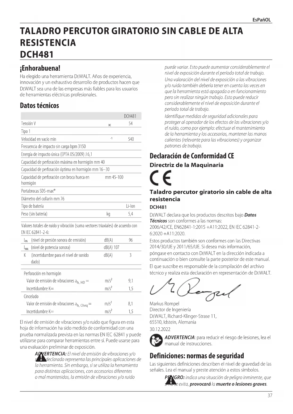 - Li-Ion cells are recyclable. Take them to your dealer or a local recycling station. The collected battery packs will be recycled or disposed ofproperly.37 EsPañOL Declaración de Conformidad CE Directriz de la Maquinaria Taladro percutor giratorio sin cable de alta resistencia DCH481 DeWALT declara que los productos descritos bajo Datos Técnicos son conformes a las normas: 2006/42/CE, EN62841-1:2015 +A11:2022, EN IEC 62841-2- 6:2020 +A11:2020. Estos productos también son conformes con las Directivas 2014/30/UE y 2011/65/UE. Si desea más información, póngase en contacto con DeWALT en la dirección indicada a continuación o bien consulte la parte posterior de estemanual. El que suscribe es responsable de la compilación del archivo técnico y realiza esta declaración en representación deDeWALT. Markus Rompel Director de Ingeniería DeWALT, Richard-Klinger-Strase 11, 65510, Idstein, Alemania