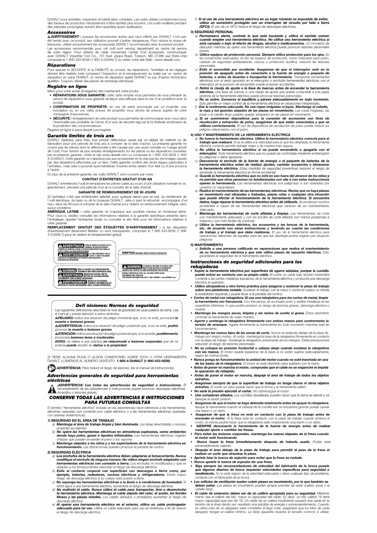 - PARA SU SEGURIDAD: Si registra el producto, podremos comunicarnos con usted en el caso improbable que se deba enviar una notificación de seguridad conforme a la Federal Consumer Safety Act (Ley Federal de Seguridad de Productos para el Consumidor). Registro en línea en www.dewalt.com/register. Garantía limitada por tres años DEWALT reparará, sin cargo, cualquier falla que surja de defectos en el material o la fabricación del producto, por hasta tres años a contar de la fecha de compra. Esta garantía no cubre fallas de las piezas causadas por su desgaste normal o abuso a la herramienta. Para mayores detalles sobre la cobertura de la garantía e información acerca de reparaciones realizadas bajo garantía, visítenos en www.dewalt.com o dirígase al centro de servicio más cercano. Esta garantía no aplica a accesorios o a daños causados por reparaciones realizadas o intentadas por terceros. Esta garantía le otorga derechos legales específicos, además de los cuales puede tener otros dependiendo del estado o la provincia en que se encuentre. Además de la garantía, las herramientas D EWALT están cubiertas por: