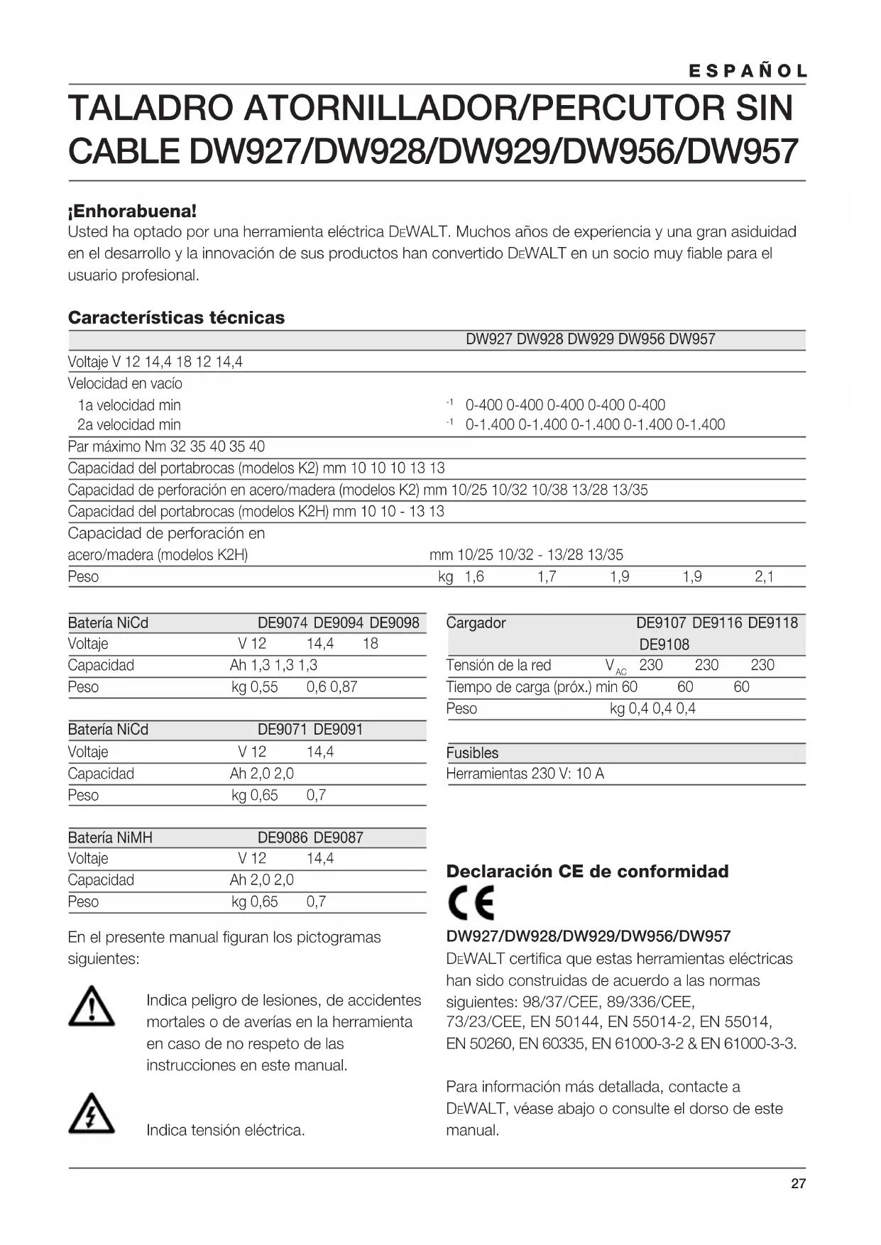Tiempo de carga (próx.) min 60 60 60 Peso kg 0,4 0,4 0,4 Fusibles Herramientas 230 V: 10 A En el presente manual figuran los pictogramas siguientes: Indica peligro de lesiones, de accidentes mortales o de averías en la herramienta en caso de no respeto de las instrucciones en este manual. Indica tensión eléctrica. Declaración CE de conformidad DW927/DW928/DW929/DW956/DW957 DEWALT certifica que estas herramientas eléctricas han sido construidas de acuerdo a las normas siguientes: 98/37/CEE, 89/336/CEE, 73/23/CEE, EN 50144, EN 55014-2, EN 55014, EN 50260, EN 60335, EN 61000-3-2 & EN 61000-3-3. Para información más detallada, contacte a DEWALT, véase abajo o consulte el dorso de este manual.28 ESPAÑOL DW927 DW928 DW929 DW956 DW957