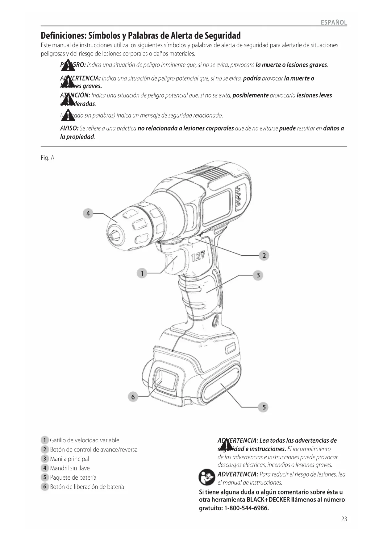 ADVERTENCIA: Lea todas las advertencias de seguridad e instrucciones. El incumplimiento de las advertencias e instrucciones puede provocar descargas eléctricas, incendios o lesionesgraves. ADVERTENCIA: Para reducir el riesgo de lesiones, lea el manual deinstrucciones. Si tiene alguna duda o algún comentario sobre ésta u otra herramienta BLACK+DECKER llámenos al número gratuito: 1-800-544-6986. Fig. A