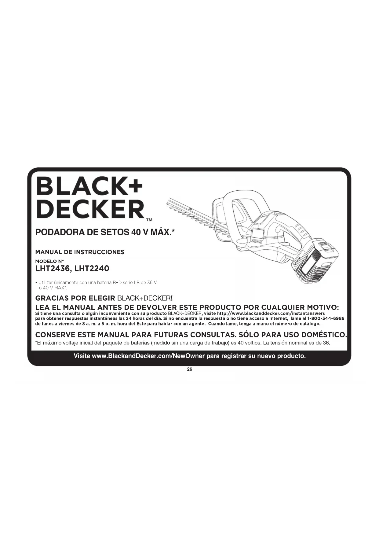 GRACIAS POR ELEGIR BLACK+DECKER! LEA EL MANUAL ANTES DE DEVOLVER ESTE PRODUCTO POR CUALQUIER MOTIVO: Si tiene una consulta o algún inconveniente con su producto BLACK+DECKER, visite http://www.blackanddecker.com/instantanswers para obtener respuestas instantáneas las 24 horas del día. Si no encuentra la respuesta o no tiene acceso a Internet, lame al 1-800-544-6986 de lunes a viernes de 8 a. m. a 5 p. m. hora del Este para hablar con un agente. Cuando lame, tenga a mano el número de catálogo. CONSERVE ESTE MANUAL PARA FUTURAS CONSULTAS. SÓLO PARA USO DOMÉSTICO. *El máximo voltaje inicial del paquete de baterías (medido sin una carga de trabajo) es 40 voltios. La tensión nominal es de 36. MODELO N° LHT2436, LHT2240 Visite www.BlackandDecker.com/NewOwner para registrar su nuevo producto.