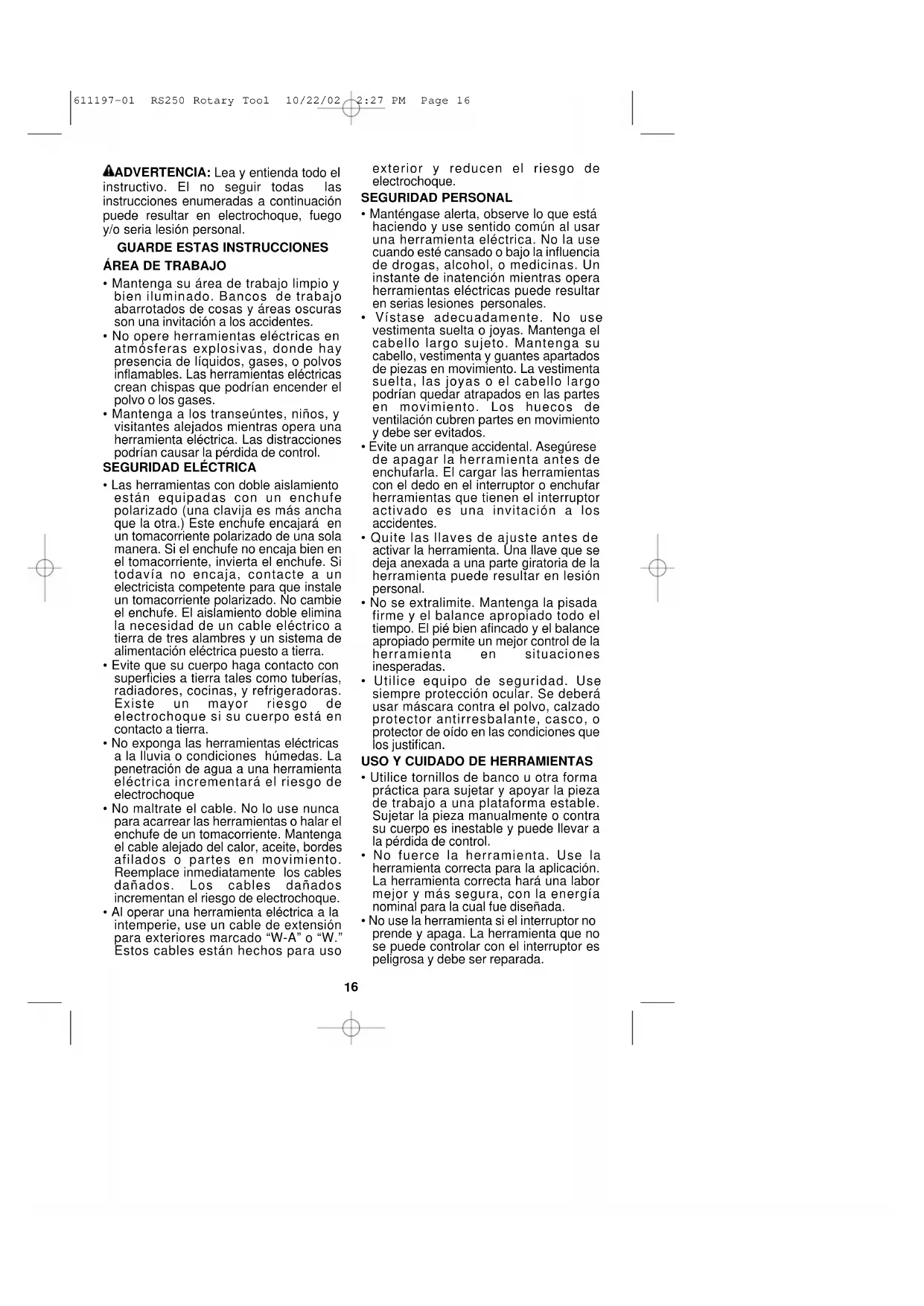 BLACK & DECKER. 611197-01 RS250 Rotary Tool 10/22/02 2:27 PM Page 1516 ADVERTENCIA: Lea y entienda todo el instructivo. El no seguir todas las instrucciones enumeradas a continuación puede resultar en electrochoque, fuego y/o seria lesión personal.