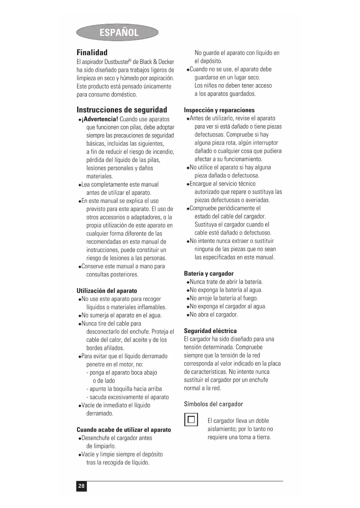 de Black & Decker ha sido diseñado para trabajos ligeros de limpieza en seco y húmedo por aspiración. Este producto está pensado únicamente para consumo doméstico. Instrucciones de seguridad ◆ ¡Advertencia! Cuando use aparatos que funcionen con pilas, debe adoptar siempre las precauciones de seguridad básicas, incluidas las siguientes, a fin de reducir el riesgo de incendio, pérdida del líquido de las pilas, lesiones personales y daños materiales. ◆ Lea completamente este manual antes de utilizar el aparato. ◆ En este manual se explica el uso previsto para este aparato. El uso de otros accesorios o adaptadores, o la propia utilización de este aparato en cualquier forma diferente de las recomendadas en este manual de instrucciones, puede constituir un riesgo de lesiones a las personas. ◆ Conserve este manual a mano para consultas posteriores. Utilización del aparato ◆ No use este aparato para recoger líquidos o materiales inflamables. ◆ No sumerja el aparato en el agua. ◆ Nunca tire del cable para desconectarlo del enchufe. Proteja el cable del calor, del aceite y de los bordes afilados. ◆ Para evitar que el líquido derramado penetre en el motor, no: - ponga el aparato boca abajo o de lado - apunte la boquilla hacia arriba - sacuda excesivamente el aparato ◆ Vacíe de inmediato el líquido derramado. Cuando acabe de utilizar el aparato ◆ Desenchufe el cargador antes de limpiarlo. ◆ Vacíe y limpie siempre el depósito tras la recogida de líquido. No guarde el aparato con líquido en el depósito. ◆ Cuando no se use, el aparato debe guardarse en un lugar seco. Los niños no deben tener acceso a los aparatos guardados. Inspección y reparaciones ◆ Antes de utilizarlo, revise el aparato para ver si está dañado o tiene piezas defectuosas. Compruebe si hay alguna pieza rota, algún interruptor dañado o cualquier cosa que pudiera afectar a su funcionamiento. ◆ No utilice el aparato si hay alguna pieza dañada o defectuosa. ◆ Encargue al servicio técnico autorizado que repare o sustituya las piezas defectuosas o averiadas. ◆ Compruebe periódicamente el estado del cable del cargador. Sustituya el cargador cuando el cable esté dañado o defectuoso. ◆ No intente nunca extraer o sustituir ninguna de las piezas que no sean las especificadas en este manual. Batería y cargador ◆ Nunca trate de abrir la batería. ◆ No exponga la batería al agua. ◆ No arroje la batería al fuego. ◆ No exponga el cargador al agua. ◆ No abra el cargador. Seguridad eléctrica El cargador ha sido diseñado para una tensión determinada. Compruebe siempre que la tensión de la red corresponda al valor indicado en la placa de características. No intente nunca sustituir el cargador por un enchufe normal a la red. Símbolos del cargador El cargador lleva un doble aislamiento; por lo tanto no requiere una toma a tierra.29 ESPAÑOL Transformador aislante a prueba de averías La alimentación de corriente está separada eléctricamente de la salida del transformador. El cargador se desconecta automáticamente si la temperatura ambiente es demasiado elevada. En cuanto la temperatura ambiente haya disminuido, el cargador seguirá funcionando. El cargador está pensado únicamente para su uso en interiores. Lea completamente el manual antes de utilizar el aparato. Características