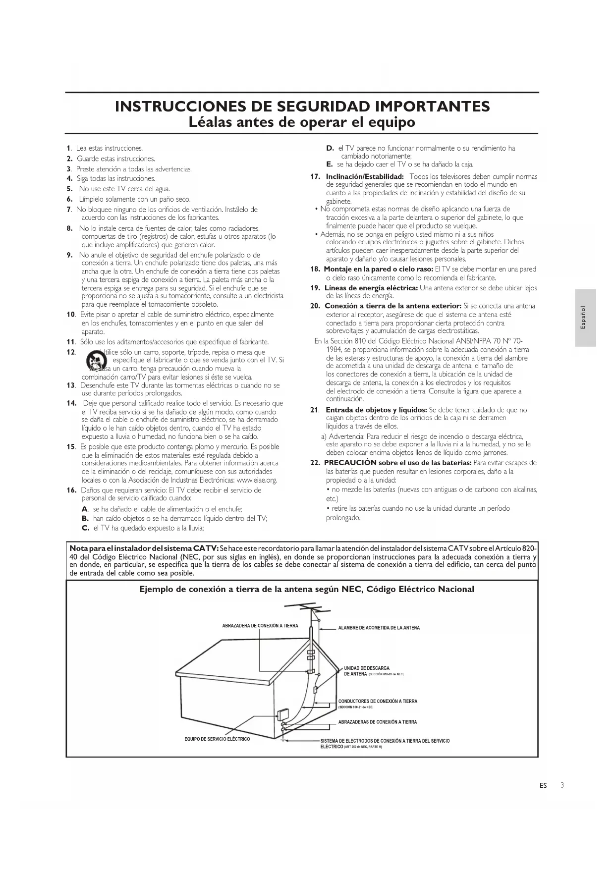 - retire las baterías cuando no use la unidad durante un período prolongado. Nota para el instalador del sistema CATV: Se hace este recordatorio para llamar la atención del instalador del sistema CATV sobre el Artículo 820- 40 del Código Eléctrico Nacional (NEC, por sus siglas en inglés), en donde se proporcionan instrucciones para la adecuada conexión a tierra y en donde, en particular, se especifica que la tierra de los cables se debe conectar al sistema de conexión a tierra del edificio, tan cerca del punto de entrada del cable como sea posible. Ejemplo de conexión a tierra de la antena según NEC, Código Eléctrico Nacional ALAMBRE DE ACOMETIDA DE LA ANTENAUNIDAD DE DESCARGADE ANTENA (SECCIÓN 810-20 de NEC)CONDUCTORES DE CONEXIÓN A TIERRA (SECCIÓN 810-21 de NEC)ABRAZADERAS DE CONEXIÓN A TIERRASISTEMA DE ELECTRODOS DE CONEXIÓN A TIERRA DEL SERVICIO ELÉCTRICO (ART 250 de NEC, PARTE H)ABRAZADERA DE CONEXIÓN A TIERRAEQUIPO DE SERVICIO ELÉCTRICO ES4 Modifi caciones La FCC exige que se informe al usuario de que cualquier cambio o modifi cación que se realice a este dispositivo, que no esté expresamente aprobado por Philips Consumer Electronics, puede anular la autoridad del usuario para operar el equipo. Cables Las conexiones a este dispositivo se deben hacer con cables blindados, con conector con caperuza metálica contra interferencia de radiofrecuencia e interferencia electromagnética, para cumplir con las normativas de la FCC. Aviso para Canadá Este aparato digital clase B cumple con todos los requisitos de las normativas canadienses para equipos que provocan interferencias. Copyright Todas las demás marcas comerciales registradas y no registradas son propiedad de sus respectivos propietarios. Fabricado bajo licencia de Dolby Laboratories. “Dolby” y el símbolo de la doble D son marcas comerciales de Dolby Laboratories. VESA, FDMI y el logotipo de cumplimiento de montaje de VESA son marcas comerciales de Video Electronics Standards Association. ® Kensington y Micro Saver son marcas comerciales registradas de los Estados Unidos de ACCO World Corporation, con registros emitidos y solicitudes pendientes en otros países del mundo. Partes de este software están protegidos por copyright © The FreeType Project (www.freetype.org). 1 Aviso 2009 © Magnavox. Todos los derechos reservados. Las especifi caciones están sujetas a cambio sin previo aviso. Las margas registradas son propiedad de Magnavox. o de sus respectivos propietarios. Magnavox se reserva el derecho de cambiar productos en cualquier momento sin estar obligada a ajustar suministros anteriores de acuerdo con dicho cambio. El material de este manual se considera adecuado para el uso para el que está destinado el sistema. Si el producto o sus módulos o procedimientos individuales se usan para fi nes distintos de los especifi cados en este documento, se debe obtener la confi rmación de su validez y adecuación. Magnavox garantiza que el material mismo no infringe ninguna patente de los Estados Unidos. No se ofrece ninguna garantía adicional expresa ni implícita. Magnavox no será responsable de ningún error en el contenido de este documento ni de los problemas que pudieran surgir como resultado del contenido de este documento. Los errores de los que se informe a Magnavox se adaptarán y publicarán en el sitio Web de soporte de Magnavox lo antes posible. Características de píxeles Este producto LCD tiene un alto número de píxeles de colores. Aunque tiene píxeles efectivos de 99,999% o más, pueden aparecer constantemente en la pantalla puntos negros o puntos brillantes de luz (rojos, verdes o azules). Ésta es una propiedad estructural de la pantalla (dentro de estándares comunes de la industria), no una falla. Garantía El usuario no puede realizar el servicio de ninguno de los componentes. No abra el producto ni retire las cubiertas que cubren su interior. Las reparaciones sólo podrán llevarlas a cabo los centros de servicio y establecimientos de reparación ofi ciales de Magnavox. De lo contrario, se anulará la garantía, ya sea expresa o implícita. Cualquier operación prohibida expresamente en este manual, o cualquier ajuste o procedimiento de montaje no recomendado o no autorizado en este manual anulará la garantía. Aviso de la Comisión Federal de Comunicaciones Este equipo se ha probado y se ha determinado que cumple con los límites para un dispositivo digital clase B, de acuerdo con la parte 15 de las normativas de la FCC. Estos límites están destinados a ofrecer una protección razonable contra interferencia dañina dentro de una instalación residencial. Este equipo genera energía de radiofrecuencia, la usa y puede emitirla y, si no se instala y usa de acuerdo con las instrucciones, puede provocar interferencia dañina a las comunicaciones radiales. Sin embargo, no existe garantía de que no se producirá interferencia en una instalación en particular. Si este equipo provoca interferencia dañina a la recepción de radio o televisión, lo cual se puede determinar encendiendo y apagando el equipo, se insta al usuario a intentar corregir la interferencia tomando una o más de las siguientes medidas: