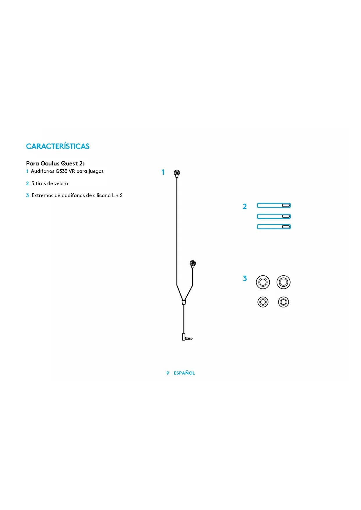 1 Cierra la tira central superior con el cable largo pasando a través de ella. Añade una tira de velcro para mantener el cable en su sitio. 2 Sosteniendo el cable de los audífonos en el interior de la diadema de Oculus Quest 2, coloca las tiras de velcro en los lados derecho e izquierdo de la diadema de Oculus Quest 2 para mantener los audífonos en su sitio.12 PORTUGUÊS RECURSOS Para Oculus Quest 2 1 Fones de ouvido para jogos G333 VR 2 3 tiras de velcro 3 Ponteiras em silicone G + P