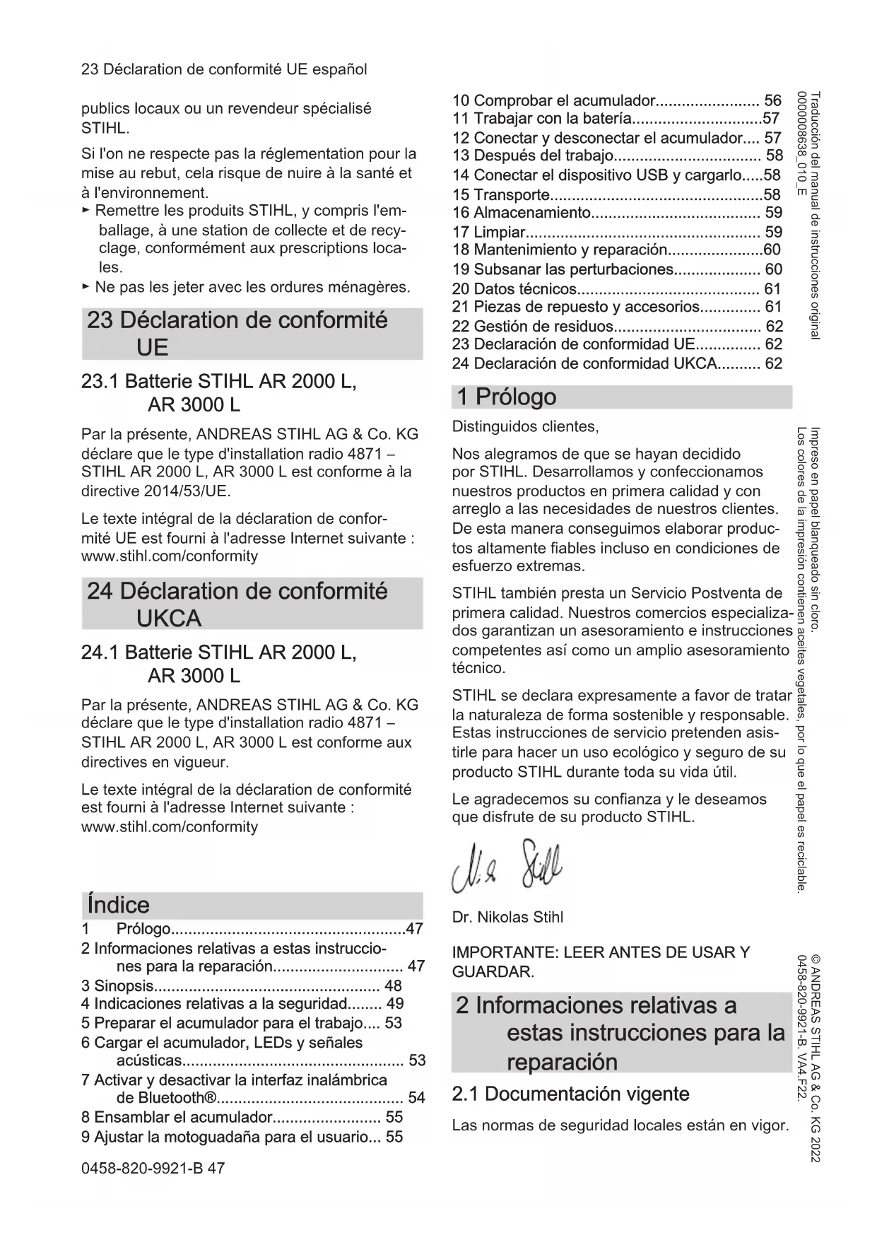 Las normas de seguridad locales están en vigor. 23 Déclaration de conformité UE español 0458-820-9921-B 47 © ANDREAS STIHL AG & Co. KG 2022 0458-820-9921-B. VA4.F22. Impreso en papel blanqueado sin cloro. Los colores de la impresión contienen aceites vegetales, por lo que el papel es reciclable. Traducción del manual de instrucciones original 0000008638_010_E► Además de este manual de instrucciones se deben leer, comprender y guardar los siguien‐ tes documentos: