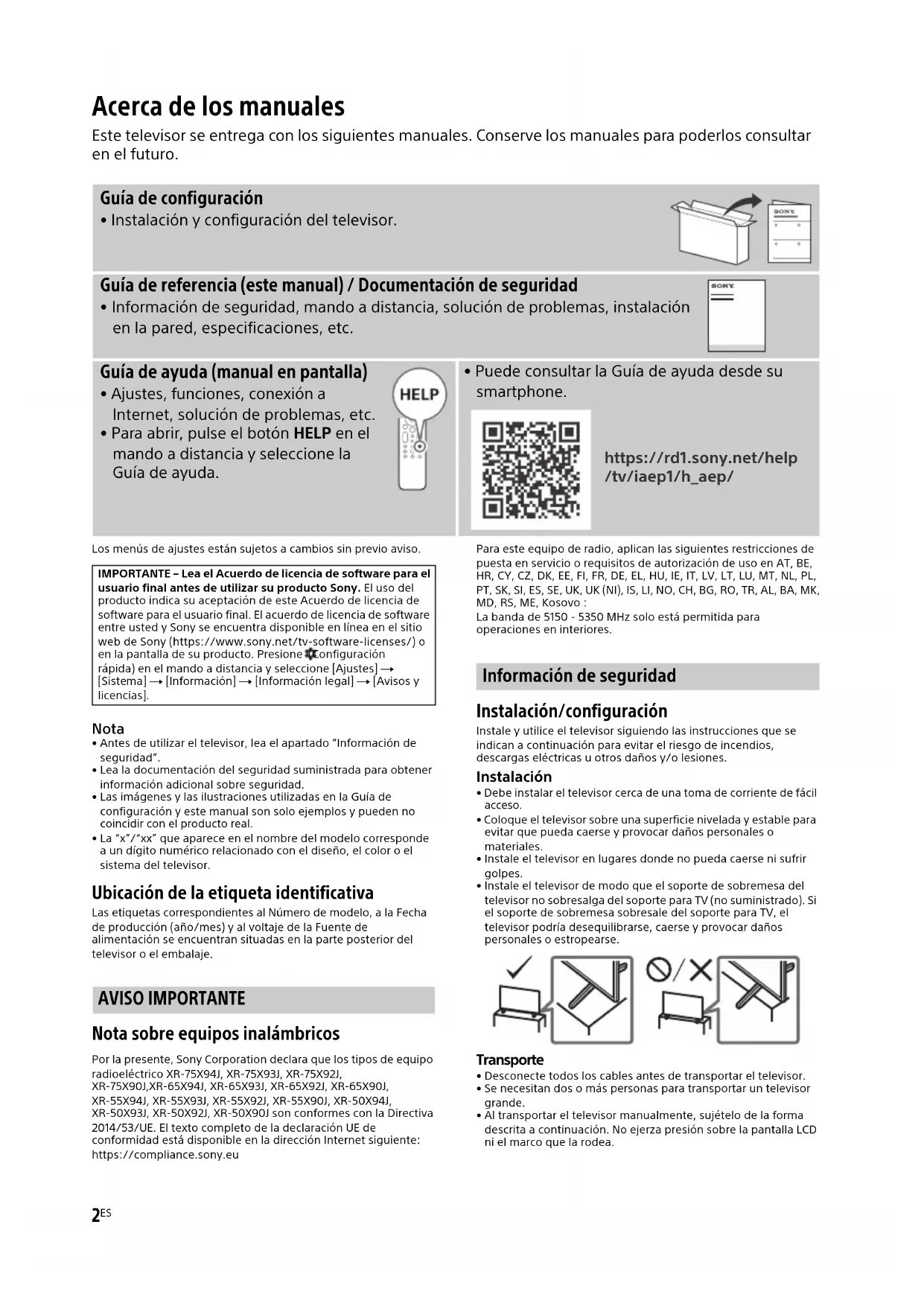 - Antes de utilizar el televisor, lea el apartado “Información de seguridad”.• Lea la documentación del seguridad suministrada para obtener información adicional sobre seguridad.• Las imágenes y las ilustraciones utilizadas en la Guía de configuración y este manual son solo ejemplos y pueden no coincidir con el producto real.• La “x”/“xx” que aparece en el nombre del modelo corresponde a un dígito numérico relacionado con el diseño, el color o el sistema del televisor. Ubicación de la etiqueta identificativa Las etiquetas correspondientes al Número de modelo, a la Fecha de producción (año/mes) y al voltaje de la Fuente de alimentación se encuentran situadas en la parte posterior del televisor o el embalaje. AVISO IMPORTANTE Nota sobre equipos inalámbricos Por la presente, Sony Corporation declara que los tipos de equipo radioeléctrico XR-75X94J, XR-75X93J, XR-75X92J, XR-75X90J,XR-65X94J, XR-65X93J, XR-65X92J, XR-65X90J, XR-55X94J, XR-55X93J, XR-55X92J, XR-55X90J, XR-50X94J, XR-50X93J, XR-50X92J, XR-50X90J son conformes con la Directiva 2014/53/UE. El texto completo de la declaración UE de conformidad está disponible en la dirección Internet siguiente: https://compliance.sony.euPara este equipo de radio, aplican las siguientes restricciones de puesta en servicio o requisitos de autorización de uso en AT, BE, HR, CY, CZ, DK, EE, FI, FR, DE, EL, HU, IE, IT, LV, LT, LU, MT, NL, PL, PT, SK, SI, ES, SE, UK, UK (NI), IS, LI, NO, CH, BG, RO, TR, AL, BA, MK, MD, RS, ME, Kosovo :La banda de 5150 - 5350 MHz solo está permitida para operaciones en interiores. Información de seguridad Instalación/configuración Instale y utilice el televisor siguiendo las instrucciones que se indican a continuación para evitar el riesgo de incendios, descargas eléctricas u otros daños y/o lesiones. Instalación