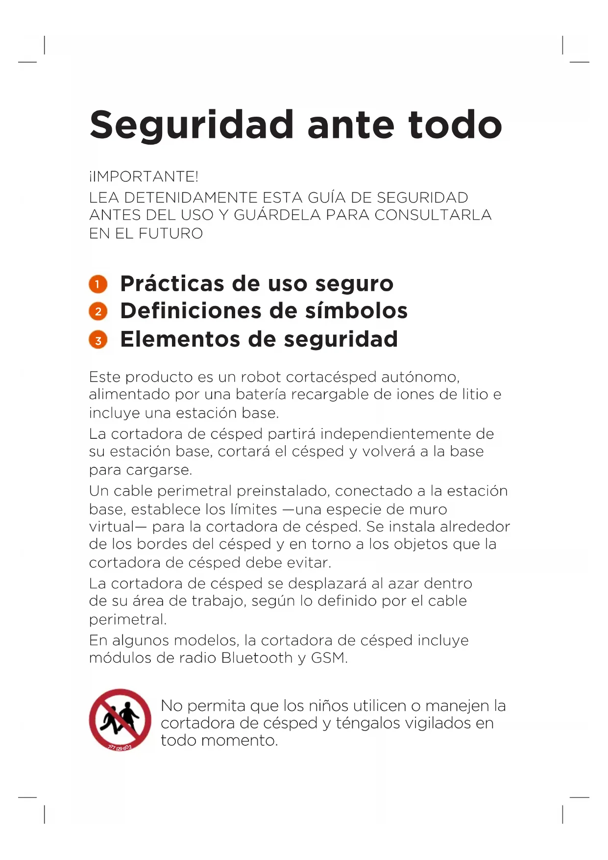 Este producto es un robot cortacésped autónomo, alimentado por una batería recargable de iones de litio e incluye una estación base. La cortadora de césped partirá independientemente de su estación base, cortará el césped y volverá a la base para cargarse. Un cable perimetral preinstalado, conectado a la estación base, establece los límites —una especie de muro virtual— para la cortadora de césped. Se instala alrededor de los bordes del césped y en torno a los objetos que la cortadora de césped debe evitar. La cortadora de césped se desplazará al azar dentro de su área de trabajo, según lo definido por el cable perimetral. En algunos modelos, la cortadora de césped incluye módulos de radio Bluetooth y GSM. Prácticas de uso seguro Definiciones de símbolos Elementos de seguridad No permita que los niños utilicen o manejen la cortadora de césped y téngalos vigilados en todo momento.