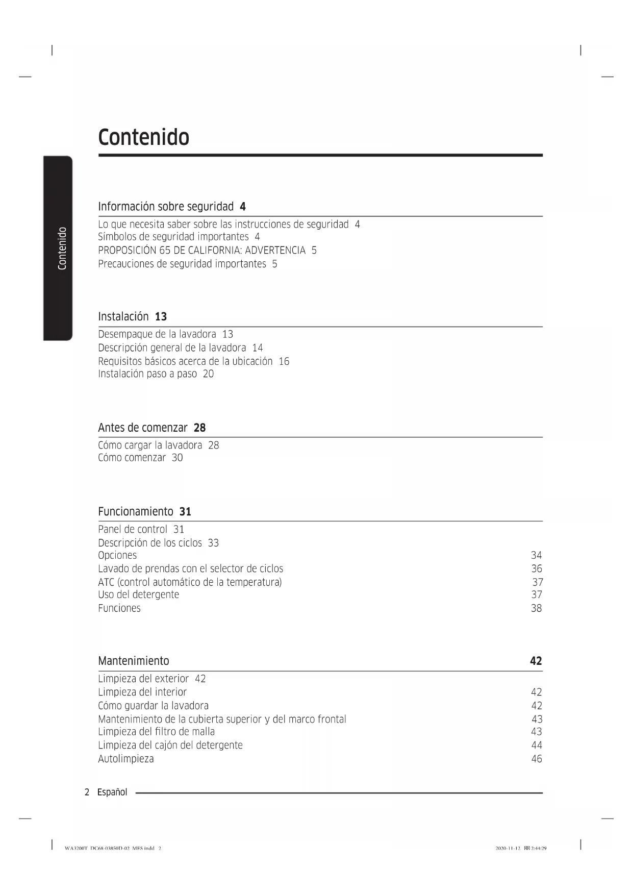 Precauciones de seguridad importantes 5 Instalación 13 Desempaque de la lavadora 13 Descripción general de la lavadora 14 Requisitos básicos acerca de la ubicación 16 Instalación paso a paso 20 Antes de comenzar 28 Cómo cargar la lavadora 28 Cómo comenzar 30 Funcionamiento 31 Panel de control 31 Descripción de los ciclos 33 Opciones 34 Lavado de prendas con el selector de ciclos 36 ATC (control automático de la temperatura) 37 Uso del detergente 37 Funciones 38 Mantenimiento 42 Limpieza del exterior 42 Limpieza del interior 42 Cómo guardar la lavadora 42 Mantenimiento de la cubierta superior y del marco frontal 43 Limpieza del ltro de malla 43 Limpieza del cajón del detergente 44 Autolimpieza 46 WA3200T_DC68-03850D-02_MES.indd 2WA3200T DC68-03850D-02 MES indd 2 2020-11-12 2:44:292020-11-12 2:44:29Español 3 Contenido Solución de problemas 47 Vericaciones 47 Códigos de información 52 Especicaciones 55 Tabla de indicaciones sobre telas 55 Ayuda al medioambiente 57 Declaración de conformidad 57 Hoja de especicaciones 58 Tabla de ciclos 59 WA3200T_DC68-03850D-02_MES.indd 3WA3200T DC68-03850D-02 MES indd 3 2020-11-12 2:44:292020-11-12 2:44:294 Español Información sobre seguridad