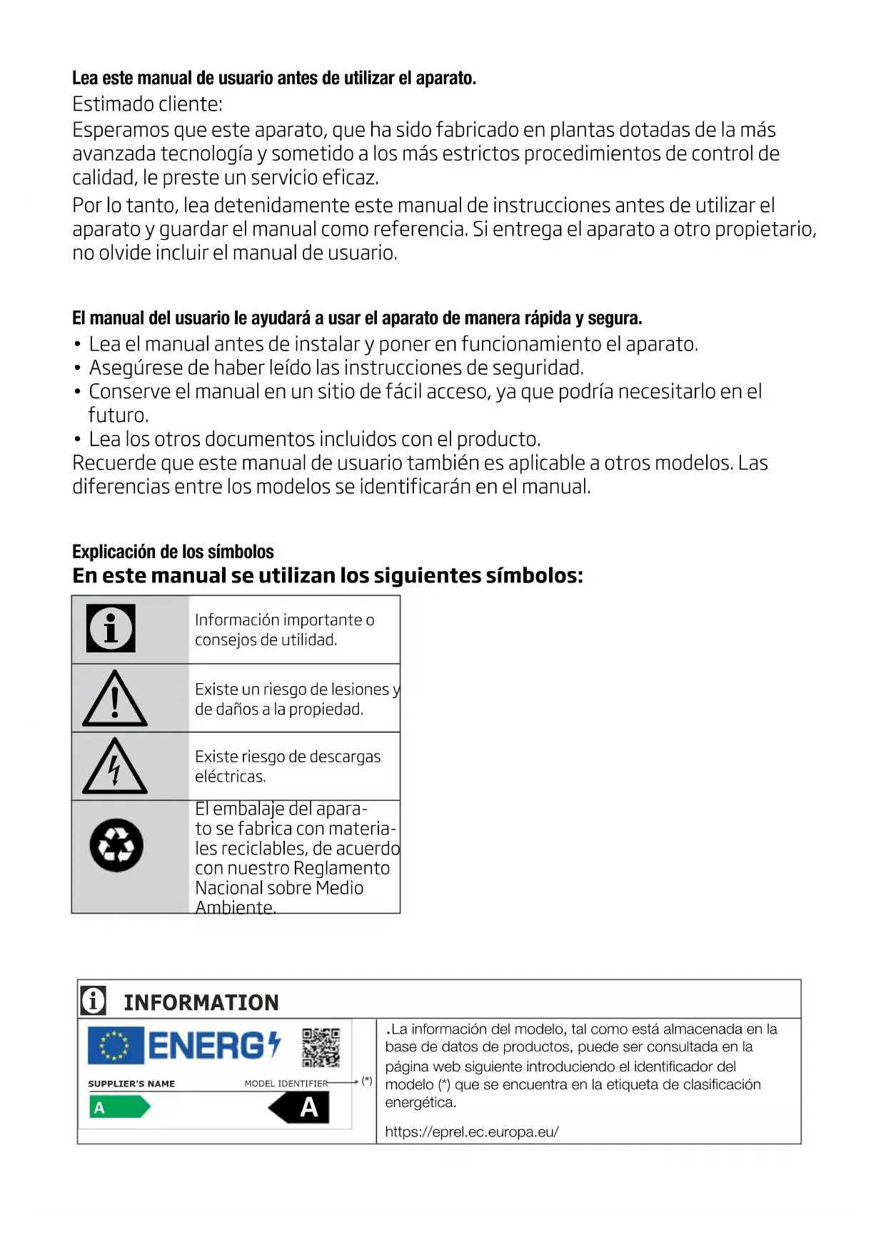 Información importante o consejos de utilidad. Existe un riesgo de lesiones y de daños a la propiedad. Existe riesgo de descargas eléctricas.El embalaje del apara-to se fabrica con materia-les reciclables, de acuerdo con nuestro Reglamento Nacional sobre Medio Ambiente. .La información del modelo, tal como está almacenada en la base de datos de productos, puede ser consultada en la página web siguiente introduciendo el identificador del modelo (*) que se encuentra en la etiqueta de clasificación energética.https://eprel.ec.europa.eu/