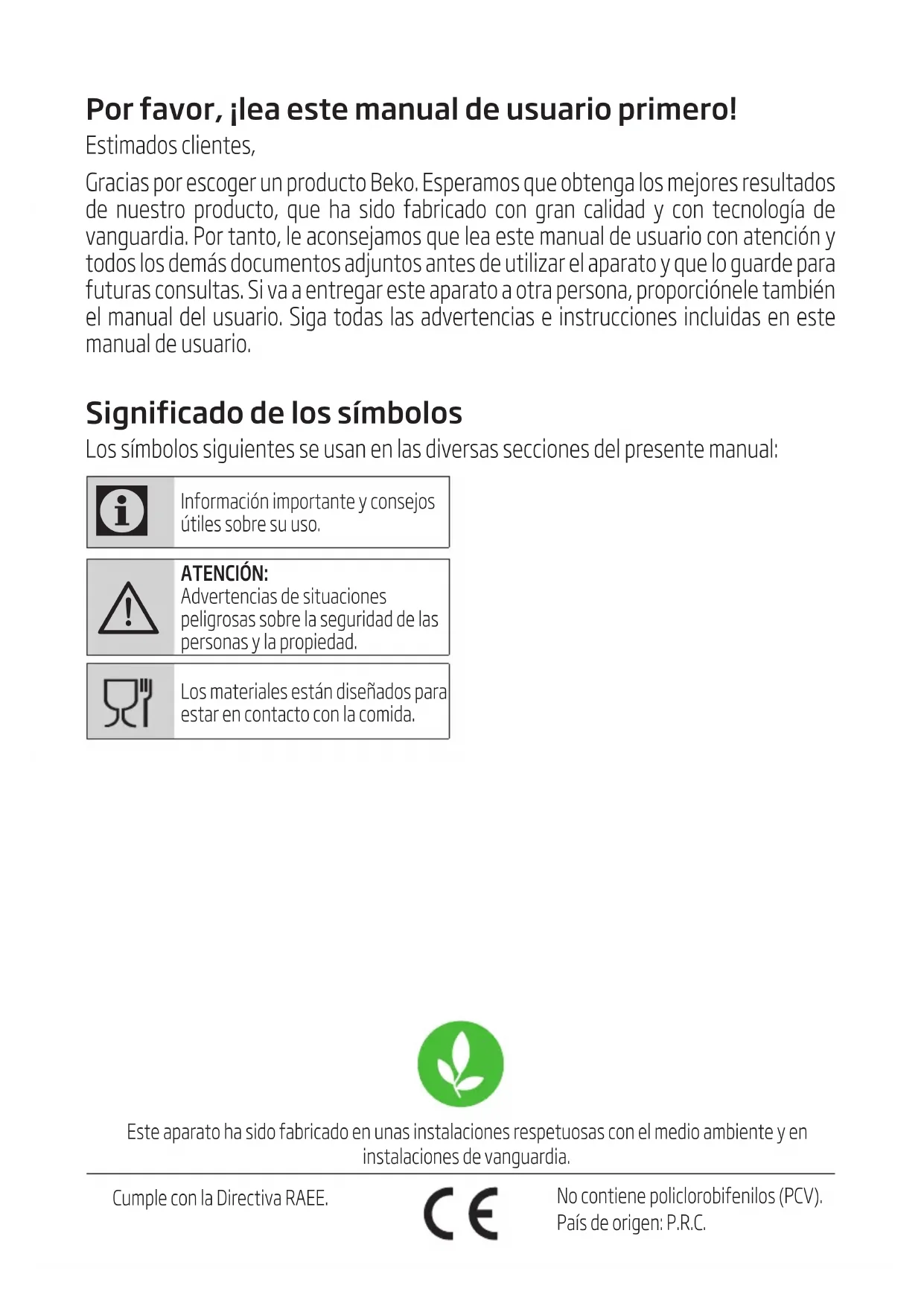 - Cihazın düşürülmesi durumunda cihaz çalışmayabilir veya kalıcı hasar oluşabilir.Por favor, ¡lea este manual de usuario primero! Estmados clentes, Gracas por escoger un producto Beko. Esperamos que obtenga los mejores resultados de nuestro producto, que ha sdo fabrcado con gran caldad y con tecnología de vanguarda. Por tanto, le aconsejamos que lea este manual de usuaro con atencón y todos los demás documentos adjuntos antes de utlzar el aparato y que lo guarde para futuras consultas. S va a entregar este aparato a otra persona, proporcónele tambén el manual del usuaro. Sga todas las advertencas e nstruccones ncludas en este manual de usuaro. Significado de los símbolos Los símbolos sguentes se usan en las dversas seccones del presente manual: