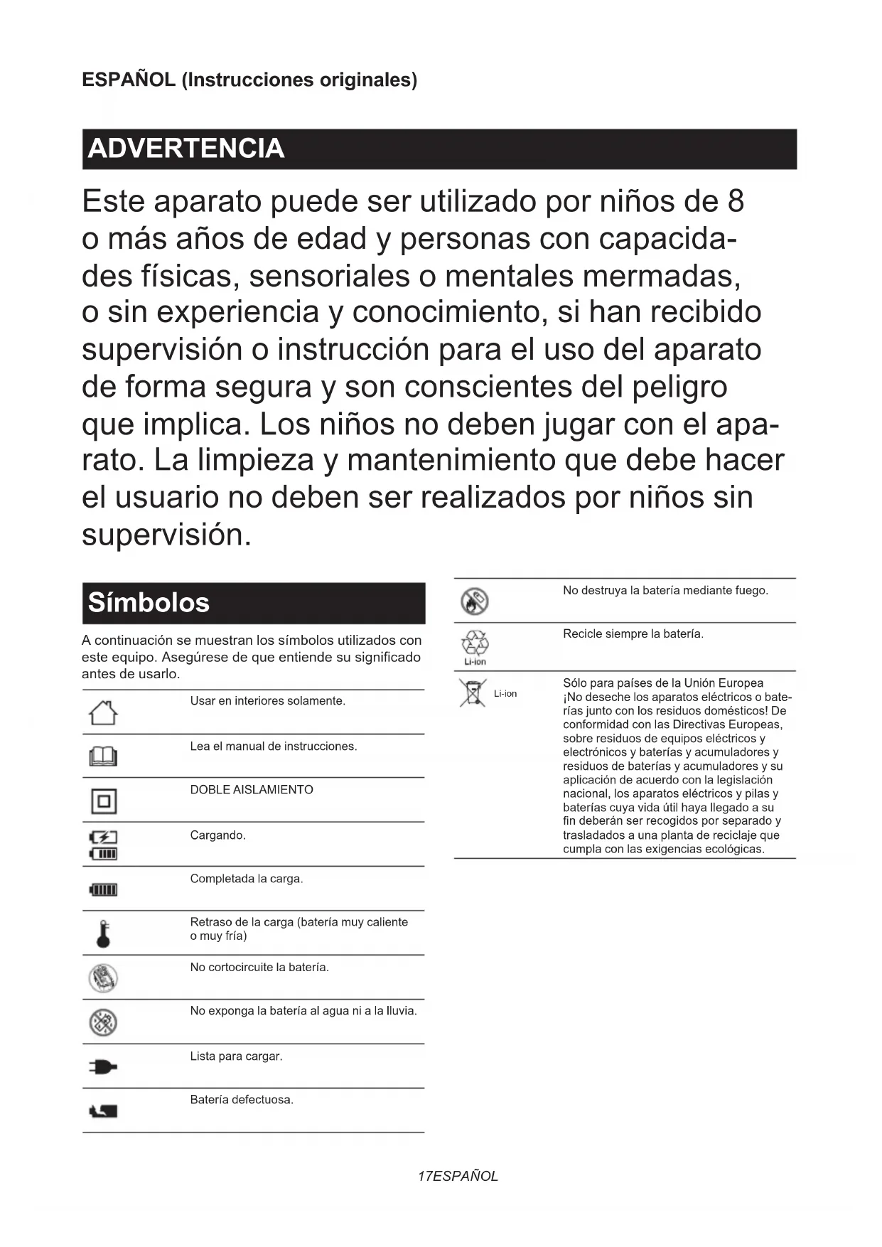 - Een accu die gedurende een lange tijd heeft gelegen op een plaats die is blootgesteld aan koude lucht. Het opladen begint nadat de accutemperatuur binnen het bereik ligt waarbij opladen mogelijk is. OPMERKING: Als het oplaadlampje beurtelings groen en rood knippert, is opladen niet mogelijk. De aansluitpun- ten van de lader of accu zijn bedekt met vuil, of de accu is versleten of beschadigd.17 ESPAÑOL ESPAÑOL (Instrucciones originales) ADVERTENCIA Este aparato puede ser utilizado por niños de 8 o más años de edad y personas con capacida- des físicas, sensoriales o mentales mermadas, o sin experiencia y conocimiento, si han recibido supervisión o instrucción para el uso del aparato de forma segura y son conscientes del peligro que implica. Los niños no deben jugar con el apa- rato. La limpieza y mantenimiento que debe hacer el usuario no deben ser realizados por niños sin supervisión. Símbolos A continuación se muestran los símbolos utilizados con este equipo. Asegúrese de que entiende su signicado antes de usarlo. Usar en interiores solamente. Lea el manual de instrucciones. DOBLE AISLAMIENTO Cargando. Completada la carga. Retraso de la carga (batería muy caliente o muy fría) No cortocircuite la batería. No exponga la batería al agua ni a la lluvia. Lista para cargar. Batería defectuosa. No destruya la batería mediante fuego. Recicle siempre la batería. Li-ion Sólo para países de la Unión Europea ¡No deseche los aparatos eléctricos o bate- rías junto con los residuos domésticos! De conformidad con las Directivas Europeas, sobre residuos de equipos eléctricos y electrónicos y baterías y acumuladores y residuos de baterías y acumuladores y su aplicación de acuerdo con la legislación nacional, los aparatos eléctricos y pilas y baterías cuya vida útil haya llegado a su n deberán ser recogidos por separado y trasladados a una planta de reciclaje que cumpla con las exigencias ecológicas.18 ESPAÑOL PRECAUCIÓN