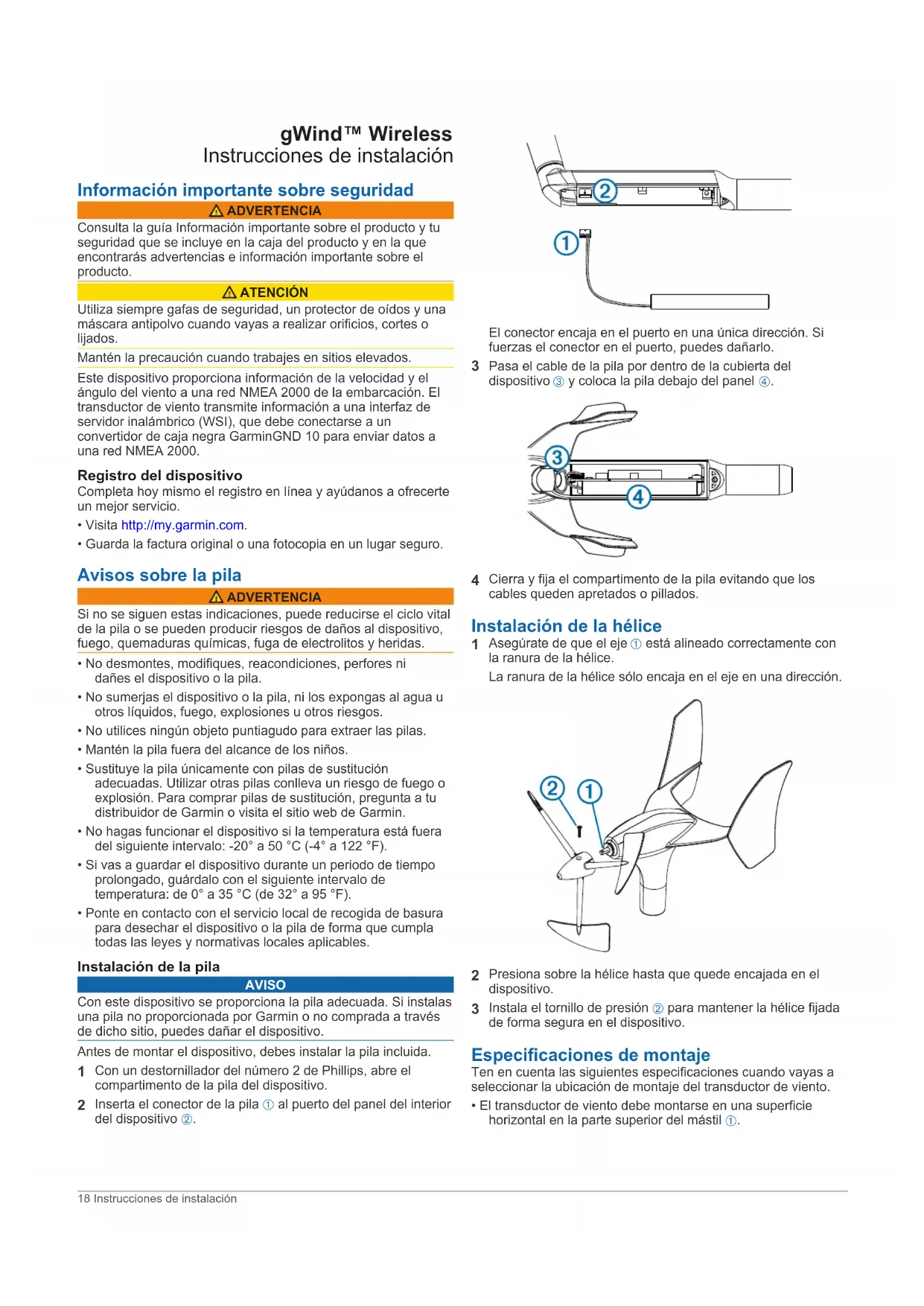 Setzen Sie die Akkuabdeckung des Windgebers wieder auf. Technische Daten Angabe Wert Abmessungen (montiert; H × L) 345 mm (13,58 Zoll) × 610 mm (24 Zoll) Gewicht 350 g (12,35 Unzen) Betriebstemperatur -20 °C bis 50 °C (-4 °F bis 122 °F) Lagertemperatur 0 °C bis 35 °C (32 °F bis 95 °F) Wasserbeständigkeit (Windgeber) IEC 60529 IPX-6 (Schutz bei rauer See) Angabe Wert Wasserbeständigkeit (WSI) IEC 60529 IPX-0 (kein spezieller Schutz) Leistungsaufnahme (WSI und GND 10) 1,1 W Typische Stromaufnahme bei 12 V Gleichspannung (WSI und GND 10) 95 mA Windgeschwindigkeitsbereich 0,9 bis 90 Knoten (0,9 bis 50 m/s) Installationsanweisungen 17gWind™ Wireless Instrucciones de instalación Información importante sobre seguridad ADVERTENCIA Consulta la guía Información importante sobre el producto y tu seguridad que se incluye en la caja del producto y en la que encontrarás advertencias e información importante sobre el producto. ATENCIÓN Utiliza siempre gafas de seguridad, un protector de oídos y una máscara antipolvo cuando vayas a realizar orificios, cortes o lijados. Mantén la precaución cuando trabajes en sitios elevados. Este dispositivo proporciona información de la velocidad y el ángulo del viento a una red NMEA 2000 de la embarcación. El transductor de viento transmite información a una interfaz de servidor inalámbrico (WSI), que debe conectarse a un convertidor de caja negra GarminGND 10 para enviar datos a una red NMEA 2000. Registro del dispositivo Completa hoy mismo el registro en línea y ayúdanos a ofrecerte un mejor servicio.