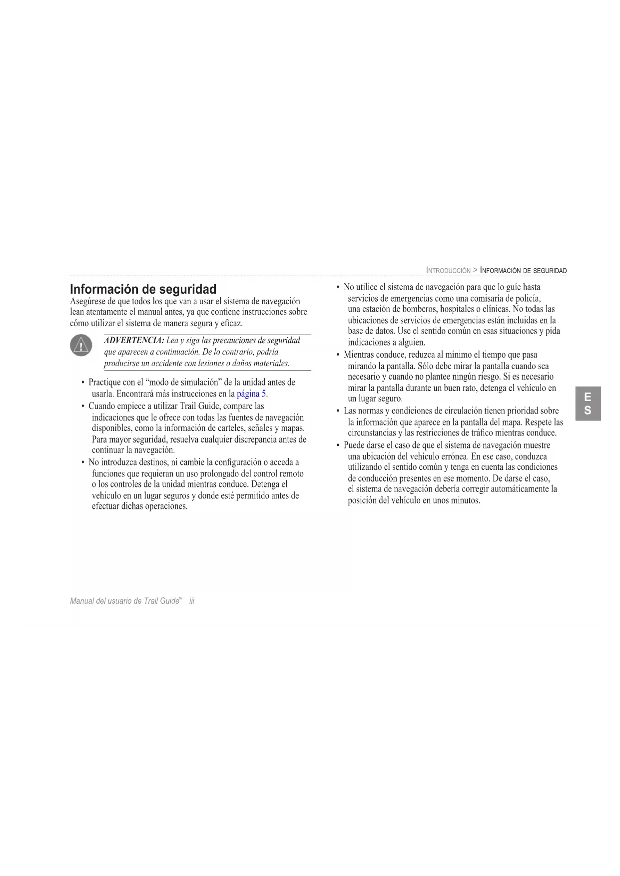 - Puede darse el caso de que el sistema de navegación muestre una ubicación del vehículo errónea. En ese caso, conduzca utilizando el sentido común y tenga en cuenta las condiciones de conducción presentes en ese momento. De darse el caso, el sistema de navegación debería corregir automáticamente la posición del vehículo en unos minutos.iv Manual del usuario de Trail Guide