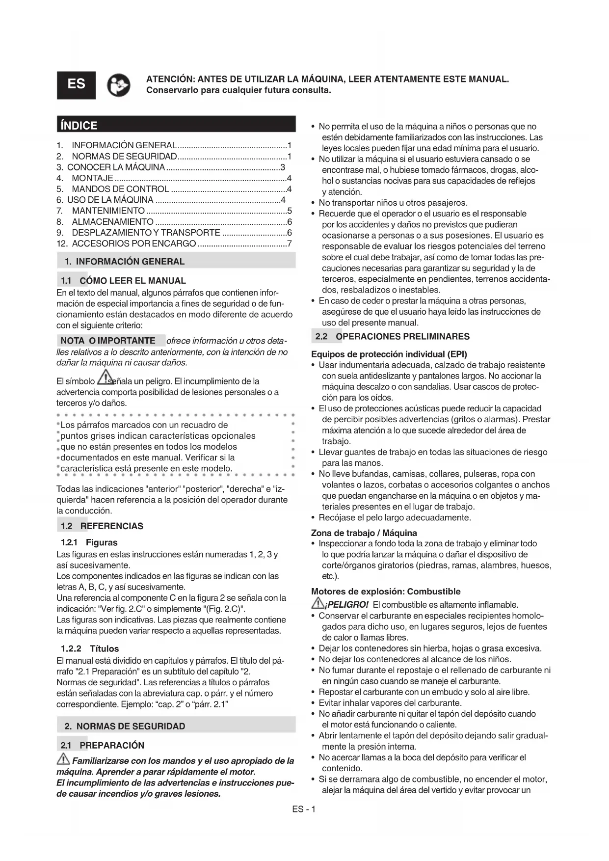 - Recuerde que el operador o el usuario es el responsable por los accidentes y daños no previstos que pudieran ocasionarse a personas o a sus posesiones. El usuario es responsable de evaluar los riesgos potenciales del terreno sobre el cual debe trabajar, así como de tomar todas las pre- cauciones necesarias para garantizar su seguridad y la de terceros, especialmente en pendientes, terrenos accidenta- dos, resbaladizos o inestables.