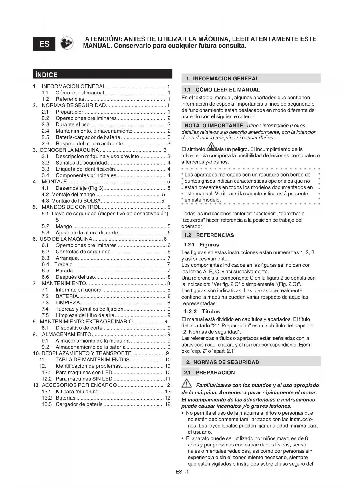 IMPORTANTE Las siguientes normas de seguridad integran las prescripciones de seguridad presentes en el manual especíco de la batería y del cargador adjunto a la máquina.